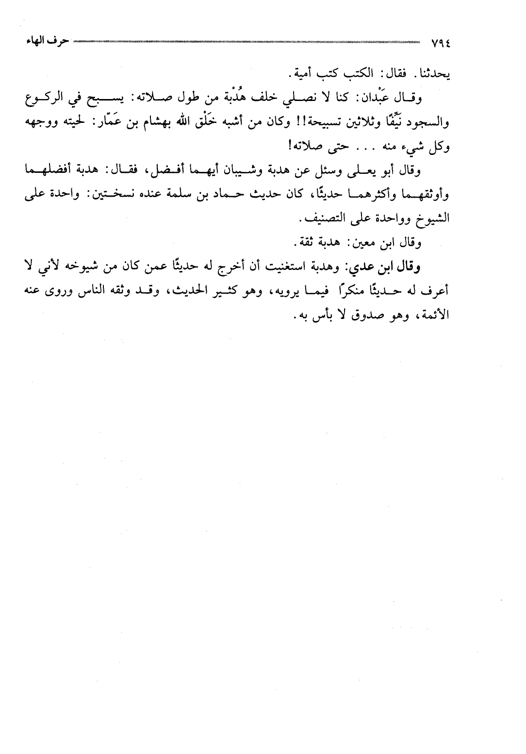 وَقَالَ عَبْدَانِ: كُنَّا لَا نصلي خلف هدبة من طول صلَاته: يسبح فِي الرُّكُوع وَالسُّجُود نيفا وَثَلَاثِينَ تَسْبِيحَة {} وَكَانَ من أشبه خلق الله بِهِشَام بن عمار: لحيته وَوَجهه وكل شَيْء مِنْهُ ... حَتَّى صلَاته!