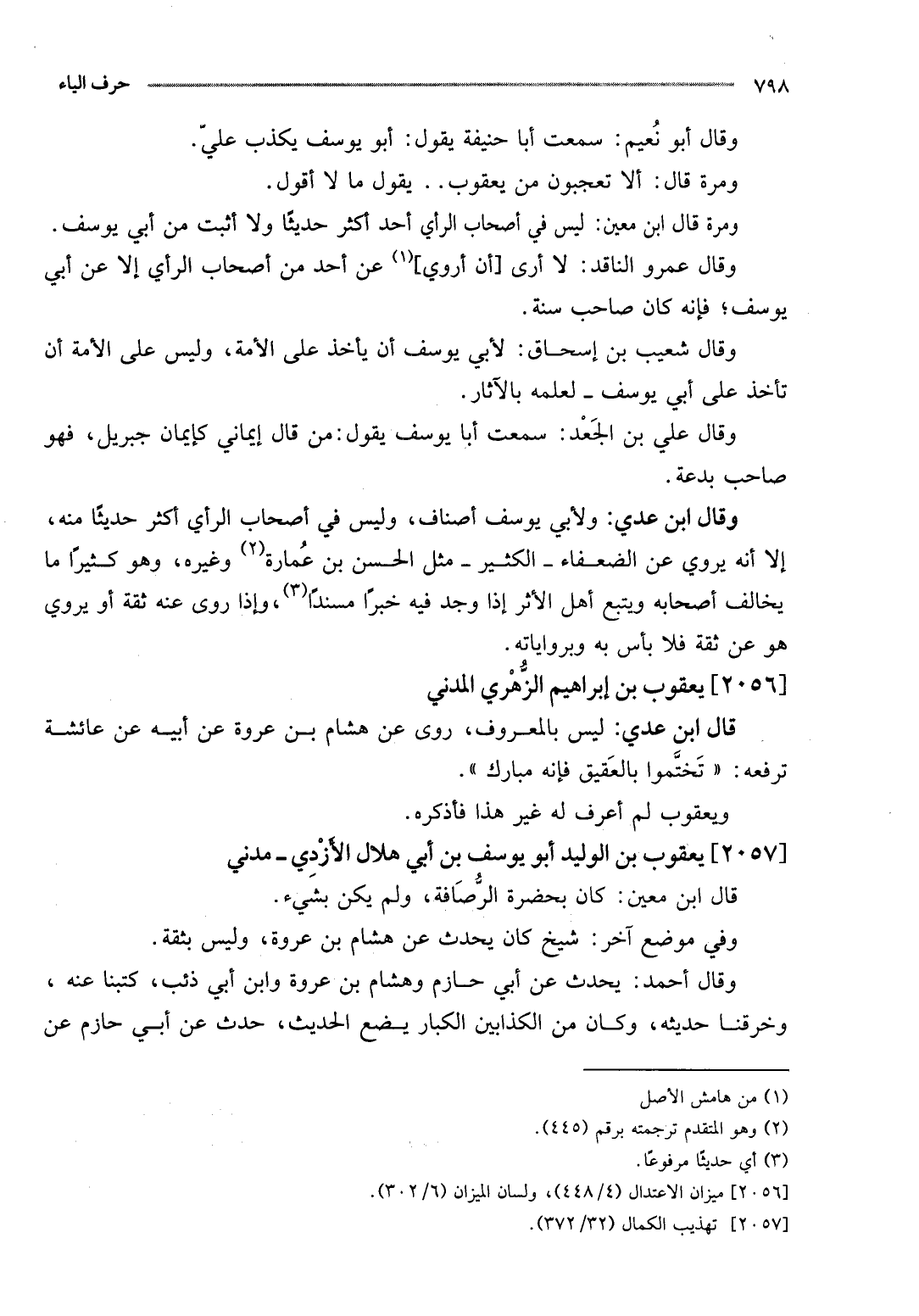 وَقَالَ ابْن عدي: وَلأبي يُوسُف أَصْنَاف، وَلَيْسَ فِي أَصْحَاب الرَّأْي أَكثر حَدِيثا مِنْهُ، إِلَّا أَنه يروي عَن الضُّعَفَاء - الْكثير - مثل الْحسن بن عمَارَة وَغَيره، وَهُوَ كثيرا مَا يُخَالف أَصْحَابه وَيتبع أهل الْأَثر إِذا وجد فِيهِ خَبرا مُسْندًا، وَإِذا روى عَنهُ ثِقَة أَو يروي هُوَ عَن ثِقَة فَلَا بَأْس بِهِ وبرواياته.