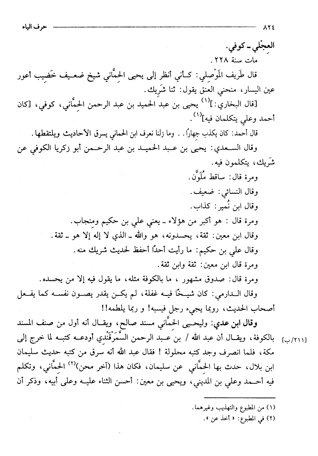 [قَالَ البُخَارِيّ:] يحيى بن عبد الحميد بن عبد الرَّحْمَن الْحمانِي، كُوفِي، [كَانَ أَحْمد وَعلي يتكلمان فِيهِ] .