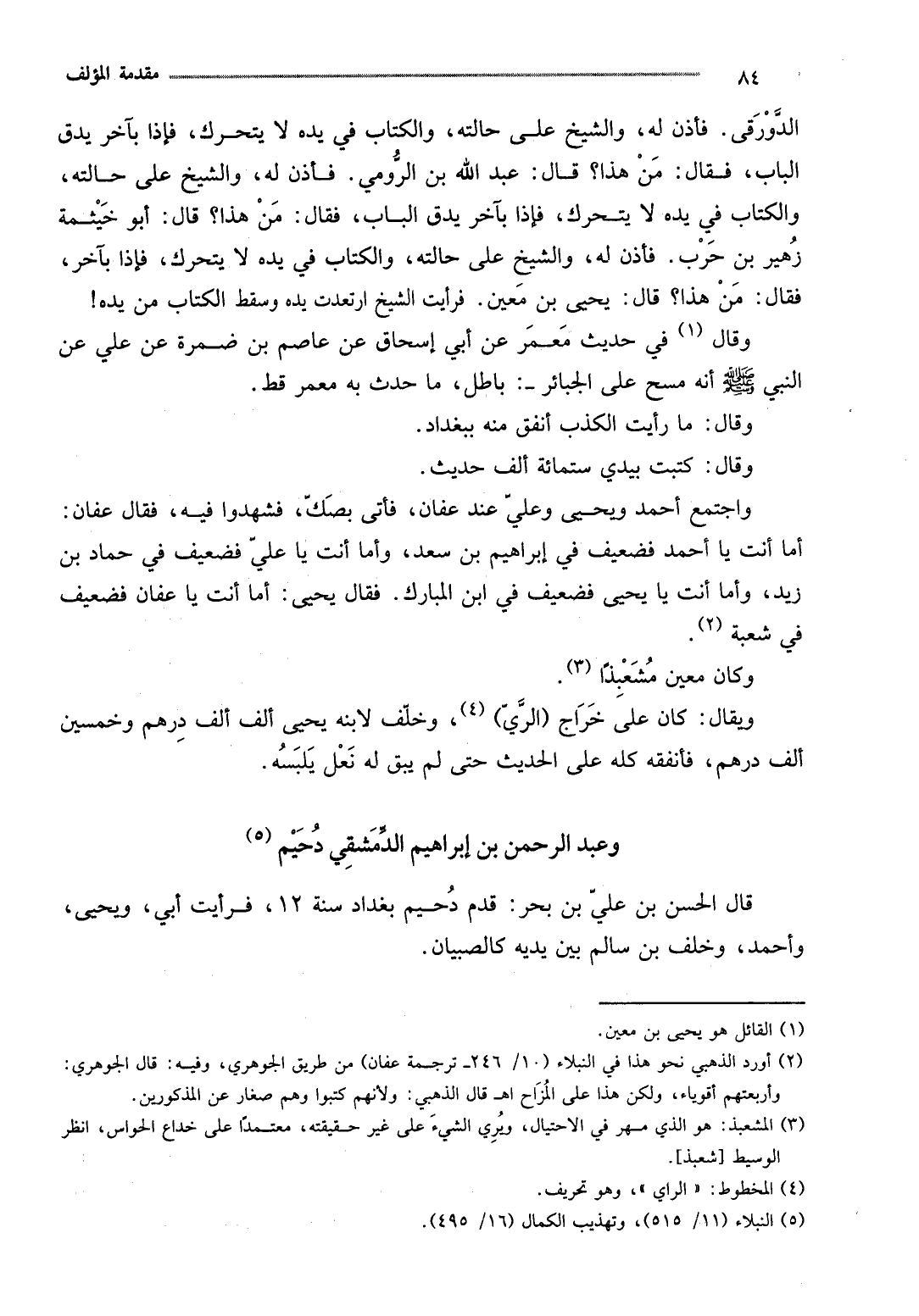 الدَّوْرَقِي. فَأذن لَهُ، وَالشَّيْخ على حَالَته، وَالْكتاب فِي يَده لَا يَتَحَرَّك، فَإِذا بآخر يدق الْبَاب، فَقَالَ: من هَذَا؟ قَالَ: عبد الله بن الرُّومِي؟ فَأذن لَهُ، وَالشَّيْخ على حَالَته، وَالْكتاب فِي يَده لَا يَتَحَرَّك، فَإِذا بآخر يدق الْبَاب، فَقَالَ: من هَذَا؟ قَالَ: أَبُو خَيْثَمَة زُهَيْر بن حَرْب. فَأذن لَهُ، وَالشَّيْخ على حَالَته، وَالْكتاب فِي يَده لَا يَتَحَرَّك، فَإِذا بآخر، فَقَالَ: من هَذَا؟ قَالَ: يحيى بن معِين. فَرَأَيْت الشَّيْخ ارتعدت يَده وَسقط الْكتاب من يَده!