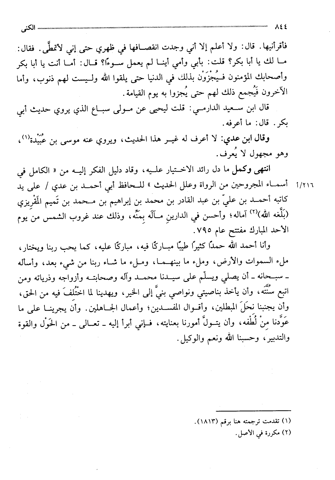 انْتهى وكمل مَا دلّ رائد الِاخْتِيَار عَلَيْهِ، وقاد دَلِيل الْفِكر إِلَيْهِ من " الْكَامِل فِي أَسمَاء الْمَجْرُوحين من الروَاة وَعلل الحَدِيث " لِلْحَافِظِ أبي أَحْمد بن عدي / على يَد كَاتبه أَحْمد بن عَليّ بن عبد الْقَادِر بن مُحَمَّد بن إِبْرَاهِيم بن مُحَمَّد بن تَمِيم المقريزي (بلغه الله) آماله؛ وَأحسن فِي الدَّاريْنِ مآله بمنه، وَذَلِكَ عِنْد غرُوب الشَّمْس من يَوْم الْأَحَد الْمُبَارك مفتتح عَام 795.