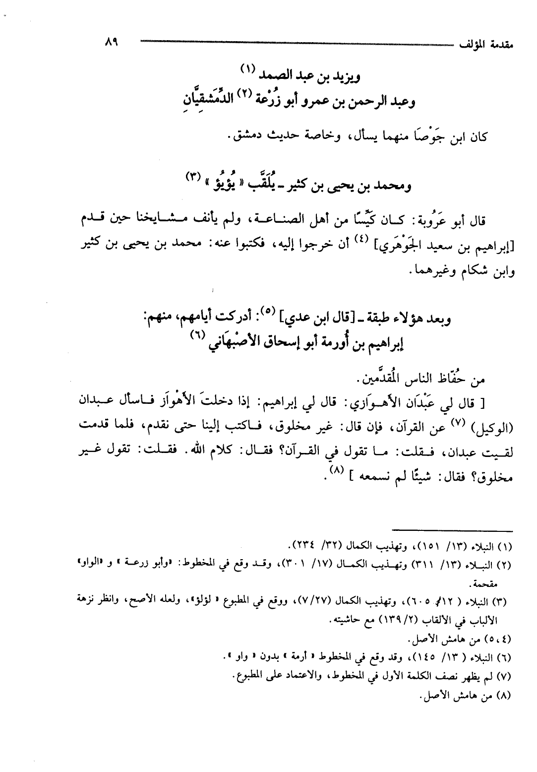 [قَالَ لي عَبْدَانِ الْأَهْوَازِي: قَالَ لي إِبْرَاهِيم: إِذا دخلت الأهواز فاسأل عَبْدَانِ (الْوَكِيل) عَن الْقُرْآن، فَإِن قَالَ: غير مَخْلُوق، فَاكْتُبْ إِلَيْنَا حَتَّى نقدم، فَلَمَّا قدمت لقِيت عَبْدَانِ، فَقلت: مَا تَقول فِي الْقُرْآن؟ فَقَالَ: كَلَام الله. فَقلت: تَقول غير مَخْلُوق؟ فَقَالَ: شَيْئا لم نَسْمَعهُ] .