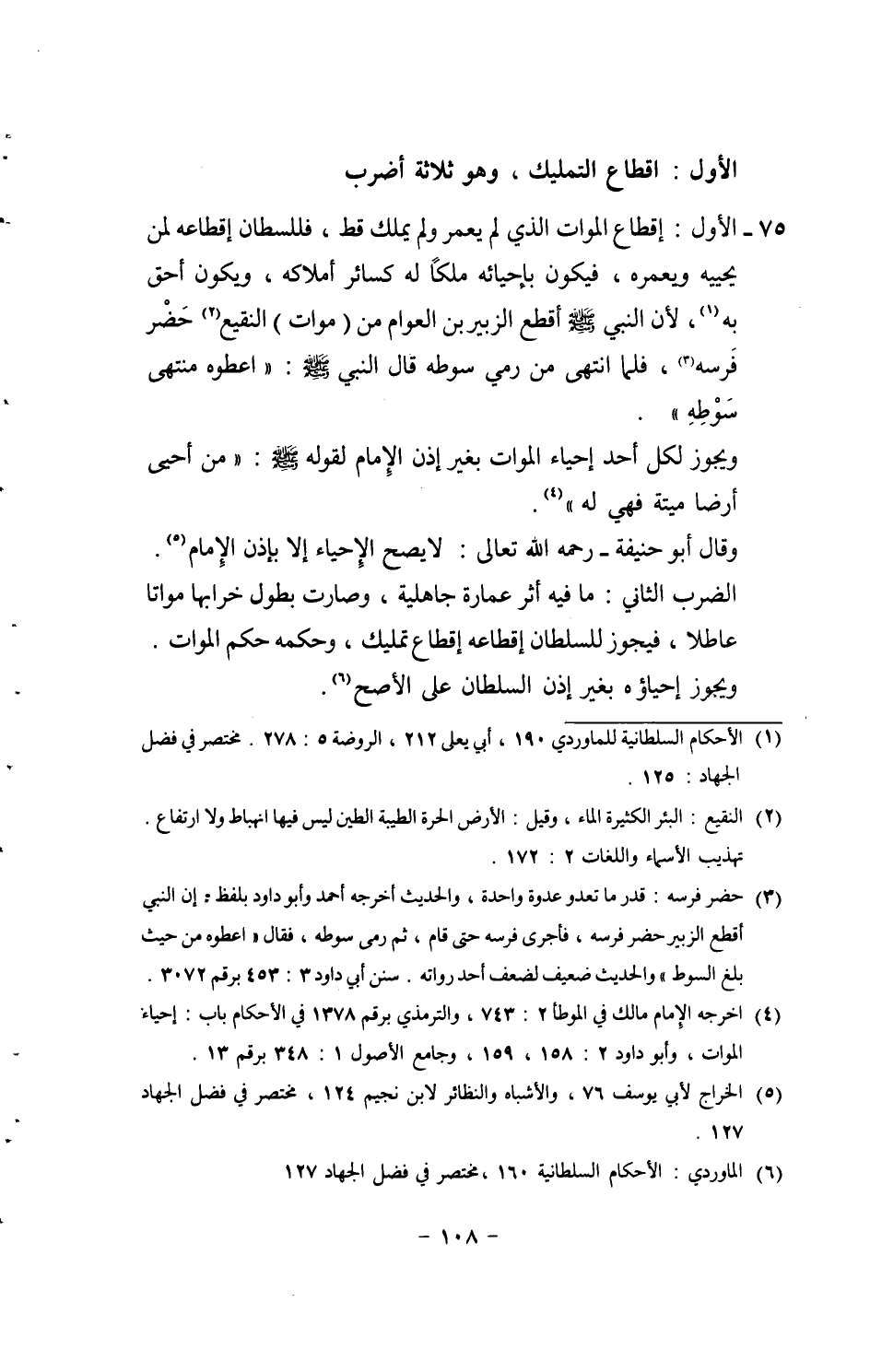 75 - الأول: إقطاع الْموَات الَّذِي لم يعمر وَلم يملك قطّ، فللسطان إقطاعه لمن يحييه ويعمره، فَيكون بإحيائه ملكا لَهُ كَسَائِر أملاكه، وَيكون أَحَق بِهِ، لِأَن النَّبِي [صلى الله عَلَيْهِ وَسلم] أقطع الزبير بن الْعَوام من (موَات) النقيع حضر فرسه، فَلَمَّا انْتهى من رمي سَوْطه قَالَ النَّبِي [صلى الله عَلَيْهِ وَسلم] : " أَعْطوهُ مُنْتَهى سَوْطه ".