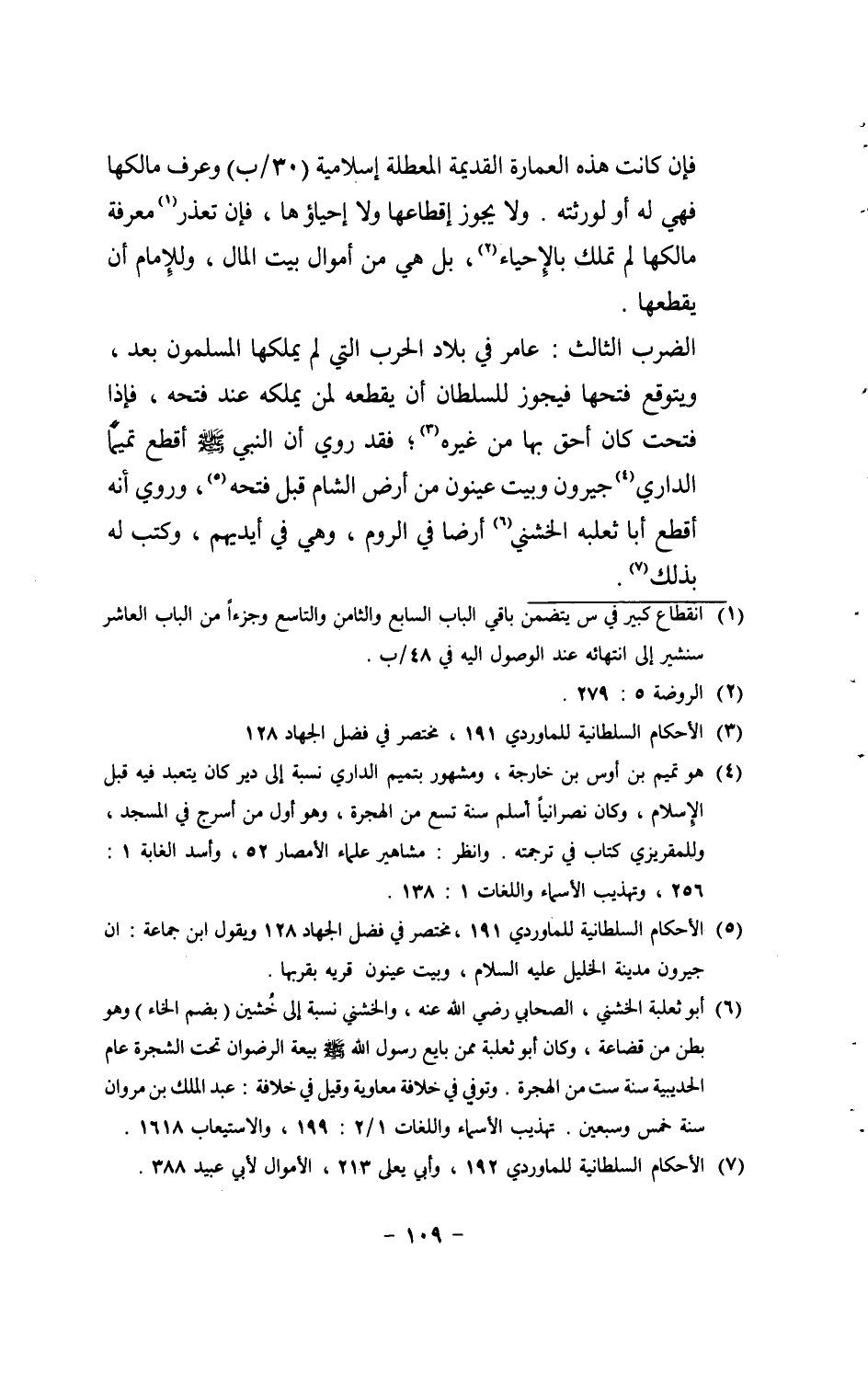 الضَّرْب الثَّالِث: عَامر فِي بِلَاد الْحَرْب الَّتِي لم يملكهَا الْمُسلمُونَ بعد، ويتوقع فتحهَا فَيجوز للسُّلْطَان أَن يقطعهُ لمن يملكهُ عِنْد فَتحه، فَإِذا فتحت كَانَ أَحَق بهَا من غَيره؛ فقد رُوِيَ أَن النَّبِي [صلى الله عَلَيْهِ وَسلم] أقطع تميماً الدَّارِيّ جيرون وَبَيت عينون من أَرض الشَّام قبل فَتحه، وَرُوِيَ أَنه أقطع أَبَا ثَعْلَبه الْخُشَنِي أَرضًا فِي الرّوم، وَهِي فِي أَيْديهم، وَكتب لَهُ بذلك.