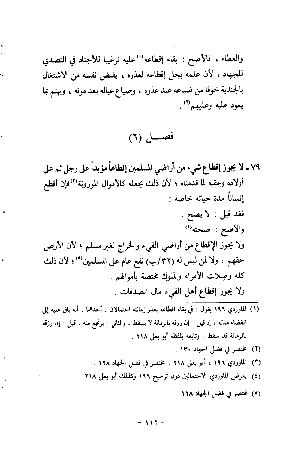 79 - لَا يجوز إقطاع شَيْء من أَرَاضِي الْمُسلمين إقطاعاً مُؤَبَّدًا على رجل ثمَّ على أَوْلَاده وعقبه لما قدمْنَاهُ؛ لِأَن ذَلِك يَجعله كالأموال الموروثة فَإِن أقطع إنْسَانا مُدَّة حَيَاته خَاصَّة: فقد قيل: لَا يَصح. وَالأَصَح: صِحَّته.
