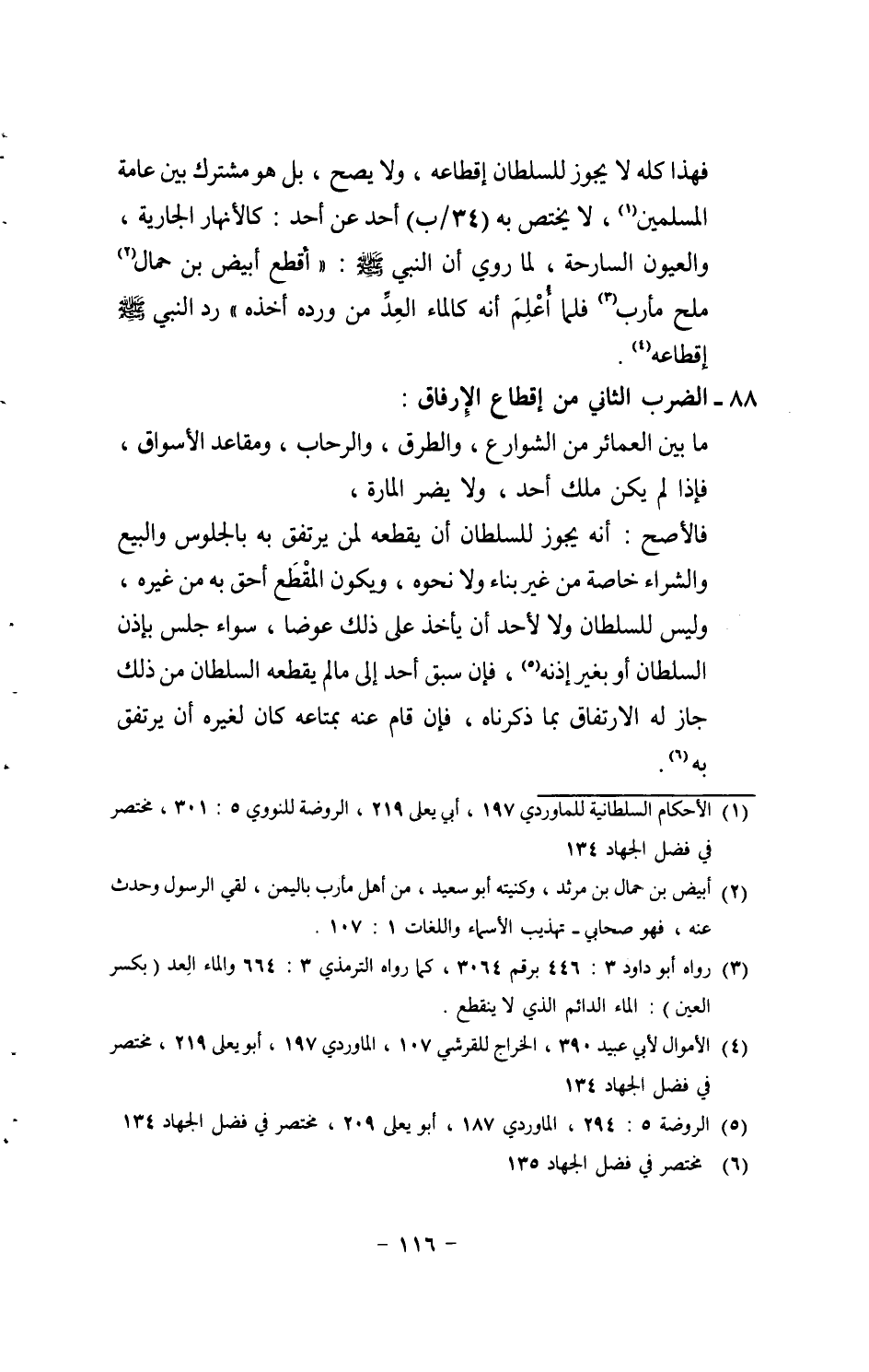 فَهَذَا كُله لَا يجوز للسُّلْطَان إقطاعه، وَلَا يَصح، بل هُوَ مُشْتَرك بَين عَامَّة الْمُسلمين، لَا يخْتَص بِهِ (34 / ب) أحد عَن أحد: كالأنهار الْجَارِيَة، والعيون السارحة، لما رُوِيَ أَن النَّبِي [صلى الله عَلَيْهِ وَسلم] : " أقطع أَبيض بن حمال ملح مأرب فَلَمَّا أعلم أَنه كَالْمَاءِ الْعد من ورده أَخذه " رد النَّبِي [صلى الله عَلَيْهِ وَسلم] إقطاعه.