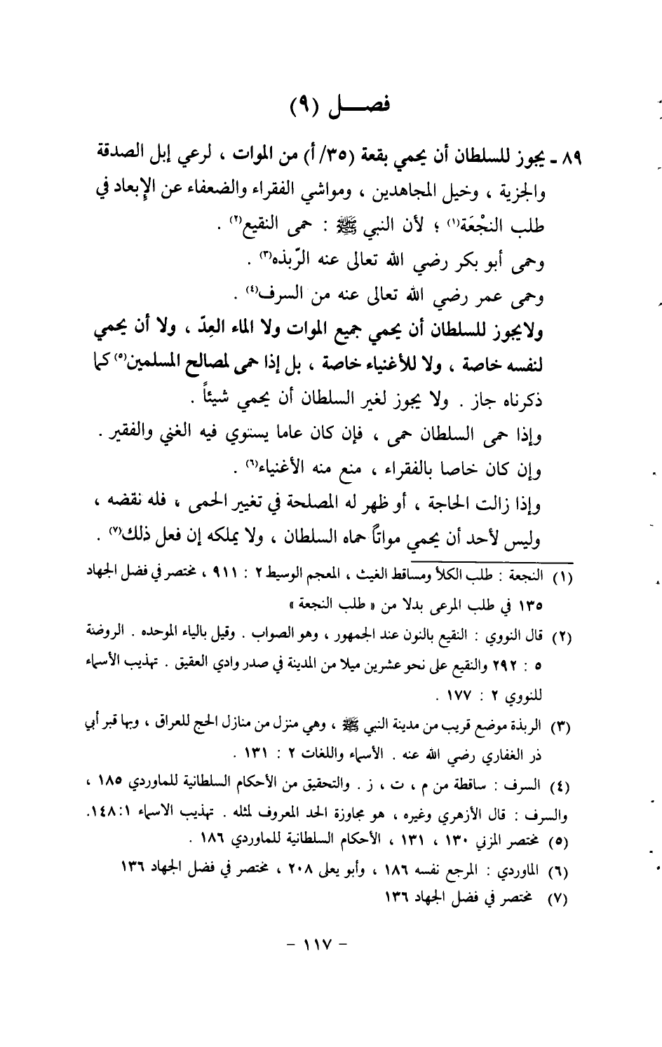 89 - يجوز للسُّلْطَان أَن يحمي بقْعَة (35 / أ) من الْموَات، لرعي إبل الصَّدَقَة والجزية، وخيل الْمُجَاهدين، ومواشي الْفُقَرَاء والضعفاء عَن الإبعاد فِي طلب النجعة؛ لِأَن النَّبِي [صلى الله عَلَيْهِ وَسلم] : حمى النقيع. وَحمى أَبُو بكر رَضِي الله تَعَالَى عَنهُ الرّبذة. وَحمى عمر رَضِي الله تَعَالَى عَنهُ من السَّرف. وَلَا يجوز للسُّلْطَان أَن يحمي جَمِيع الْموَات وَلَا المَاء العدّ، وَلَا أَن يحمي لنَفسِهِ خَاصَّة، وَلَا للأغنياء خَاصَّة، بل إِذا حمى لمصَالح الْمُسلمين كَمَا ذَكرْنَاهُ جَازَ. وَلَا يجوز لغير السُّلْطَان أَن يحمي شَيْئا. وَإِذا حمى السُّلْطَان حمى، فَإِن كَانَ عَاما يَسْتَوِي فِيهِ الْغَنِيّ وَالْفَقِير. وَإِن كَانَ خَاصّا بالفقراء، منع مِنْهُ الْأَغْنِيَاء. وَإِذا زَالَت الْحَاجة، أَو ظهر لَهُ الْمصلحَة فِي تَغْيِير الْحمى، فَلهُ نقضه، وَلَيْسَ لأحد أَن يحمي مواتاً حماه السُّلْطَان، وَلَا يملكهُ إِن فعل ذَلِك.