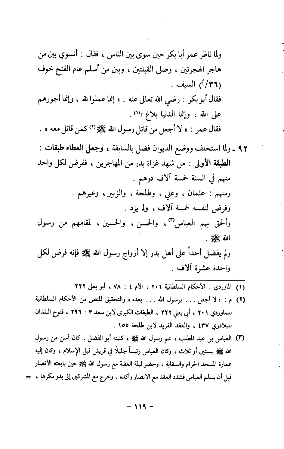 92 - وَلما اسْتخْلف وَوضع الدِّيوَان فضل بالسابقة، وَجعل الْعَطاء طَبَقَات: الطَّبَقَة الأولى: من شهد غزَاة بدر من الْمُهَاجِرين، فَفرض لكل وَاحِد مِنْهُم فِي السّنة خَمْسَة آلَاف دِرْهَم. وَمِنْهُم: عُثْمَان، وَعلي وَطَلْحَة، وَالزُّبَيْر، وَغَيرهم. وَفرض لنَفسِهِ خَمْسَة آلَاف، وَلم يزدْ.