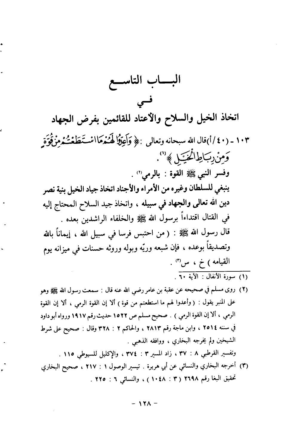 103 - (40 / أ) قَالَ الله سُبْحَانَهُ وَتَعَالَى: {وَأَعدُّوا لَهُم مَا اسْتَطَعْتُم من قُوَّة وَمن رِبَاط الْخَيل} .