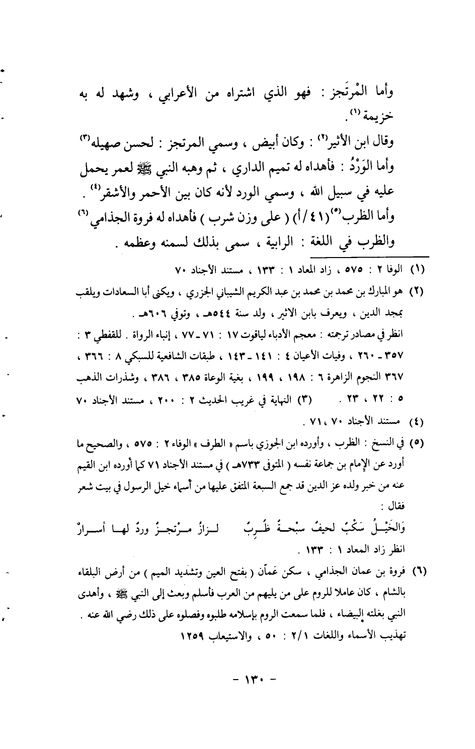 وَأما المرتجز: فَهُوَ الَّذِي اشْتَرَاهُ من الْأَعرَابِي، وَشهد لَهُ بِهِ خُزَيْمَة. وَقَالَ ابْن الْأَثِير: وَكَانَ أَبيض، وَسمي المرتجز: لحسن صهيله وَأما الْورْد: فأهداه لَهُ تَمِيم الدَّارِيّ، ثمَّ وهبه النَّبِي [صلى الله عَلَيْهِ وَسلم] لعمر يحمل عَلَيْهِ فِي سَبِيل الله، وَسمي الْورْد لِأَنَّهُ كَانَ بَين الْأَحْمَر والأشقر. وَأما الظرب (41 / أ) (على وزن شرب) فأهداه لَهُ فَرْوَة الجذامي والظرب فِي اللُّغَة: الرابية، سمى بذلك لسمنه وعظمه.