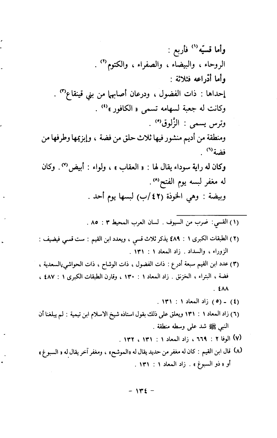 وَأما قسيه فأربع: الروحاء، والبيضاء، والصفراء، والكتوم. وَأما أدراعه فَثَلَاثَة: إِحْدَاهَا: ذَات الفضول، ودرعان أصابهما من بني قينقاع. وَكَانَت لَهُ جعبة لسهامه تسمى " الكافور ". وترس يُسمى: الزّلوق. ومنطقة من أَدِيم منشور فِيهَا ثَلَاث حلق من فضَّة، وإبزيمها وطرفها من فضَّة. وَكَانَ لَهُ راية سَوْدَاء يُقَال لَهَا: " الْعقَاب "، ولواء: أَبيض. وَكَانَ لَهُ مغفر لبسه يَوْم الْفَتْح. وبيضة: وَهِي الخوذة (42 / ب) لبسهَا يَوْم أحد.