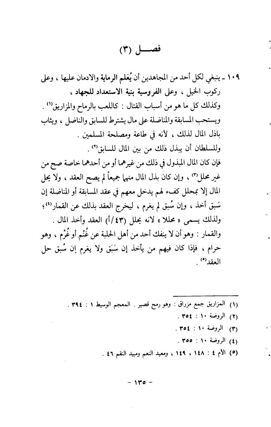 106 - يَنْبَغِي لكل أحد من الْمُجَاهدين أَن يعلم الرماية والادمان عَلَيْهَا، وعَلى ركُوب الْخَيل، وعَلى الفروسية بنية الاستعداد للْجِهَاد، وَكَذَلِكَ كل مَا هُوَ من أَسبَاب الْقِتَال: كاللعب بِالرِّمَاحِ والمزاريق. وَيسْتَحب الْمُسَابقَة والمناضلة على مَال يشْتَرط للسابق والناضل، ويثاب باذل المَال لذَلِك، لِأَنَّهُ فِي طَاعَة ومصلحة الْمُسلمين. وللسلطان أَن يبْذل ذَلِك من بَين المَال للسابق. فَإِن كَانَ المَال المبذول فِي ذَلِك من غَيرهمَا أَو من أَحدهمَا خَاصَّة صَحَّ من غير مُحَلل، وَإِن كَانَ بذل المَال مِنْهُمَا لم يَصح العقد، وَلَا يحل المَال إِلَّا بِمُحَلل كُفْء لَهُم يدْخل مَعَهم فِي عقد الْمُسَابقَة أَو المناضلة إِن سبق أَخذ، وَإِن سبق لم يغرم، ليخرج العقد بذلك عَن الْقمَار؛ وَلذَلِك يُسمى " محللا " لِأَنَّهُ يحلل (43 / أ) العقد وَأخذ المَال. والقمار: وَهُوَ أَن لَا يَنْفَكّ أحد من أهل الحلبة عَن غنم أَو غرم، وَهُوَ حرَام، فَإِذا كَانَ فيهم من يَأْخُذ إِن سبق وَلَا يغرم إِن سبق حل العقد.