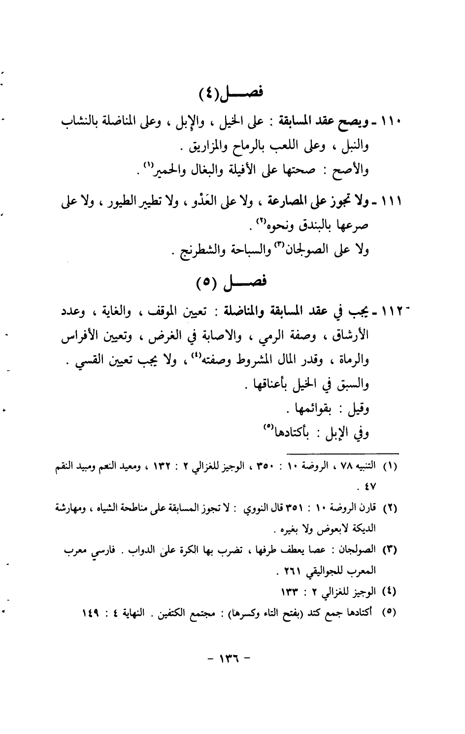 112 - يجب فِي عقد الْمُسَابقَة والمناضلة: تعْيين الْموقف، والغاية، وَعدد الأرشاق، وَصفَة الرَّمْي، والإصابة فِي الْغَرَض، وَتَعْيِين الأفراس وَالرُّمَاة، وَقدر المَال الْمَشْرُوط وَصفته، وَلَا يجب تعْيين القسي. والسبق فِي الْخَيل بأعناقها. وَقيل: بقوائمها. وَفِي الْإِبِل: بأكتادها