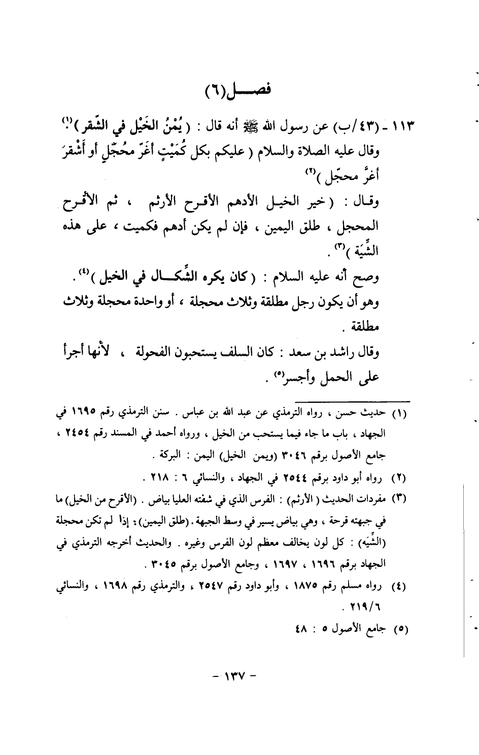 113 - (43 / ب) عَن رَسُول الله [صلى الله عَلَيْهِ وَسلم] أَنه قَالَ: (يمن الْخَيل فِي الشّقر) . وَقَالَ عَلَيْهِ الصَّلَاة وَالسَّلَام (عَلَيْكُم بِكُل كميتٍ أغر محجل أَو أشقر أغر محجل) . وَقَالَ: (خير الْخَيل الأدهم الأقرح الأرثم، ثمَّ الأقرح المحجل، طلق الْيَمين، فَإِن لم يكن أدهم فكميت على هَذِه الشية) .