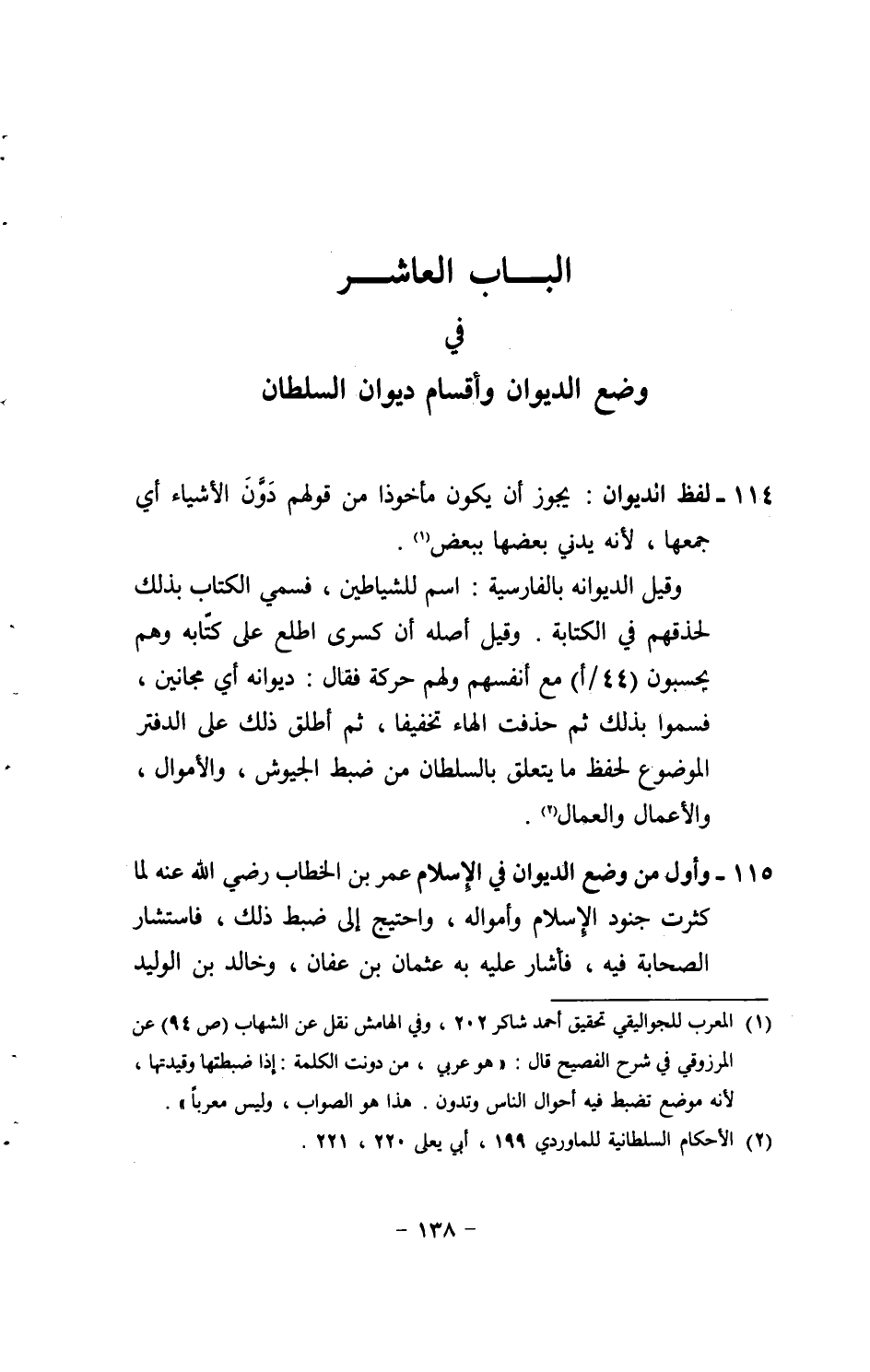 وَقيل الديوانه بِالْفَارِسِيَّةِ: اسْم للشياطين، فَسُمي الْكتاب بذلك لحذقهم فِي الْكِتَابَة. وَقيل أَصله أَن كسْرَى اطلع على كِتَابه وهم يحسبون (44 / أ) مَعَ أنفسهم وَلَهُم حَرَكَة فَقَالَ: ديوانه أَي مجانين، فسموا بذلك ثمَّ حذفت الْهَاء تَخْفِيفًا، ثمَّ أطلق ذَلِك على الدفتر الْمَوْضُوع لحفظ مَا يتَعَلَّق بالسلطان من ضبط الجيوش، وَالْأَمْوَال، والأعمال والعمال.