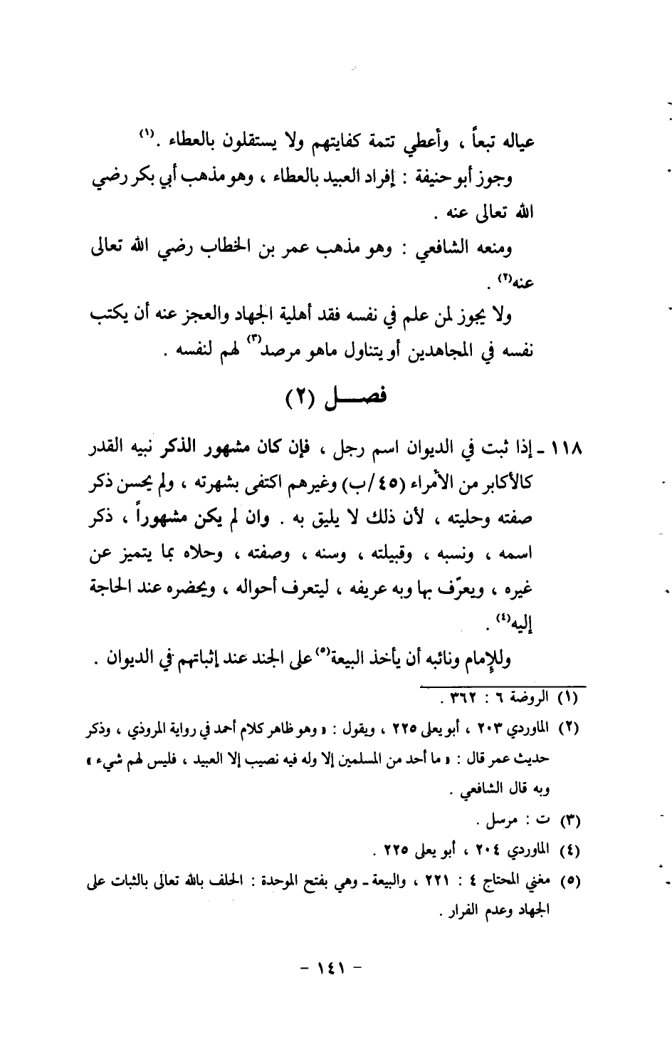118 - إِذا ثَبت فِي الدِّيوَان اسْم رجل، فَإِن كَانَ مَشْهُور الذّكر نبيه الْقدر كالأكابر من الْأُمَرَاء (45 / ب) وَغَيرهم اكْتفى بشهرته، وَلم يحسن ذكر صفته وحليته، لِأَن ذَلِك لَا يَلِيق بِهِ. وَإِن لم يكن مَشْهُورا، ذكر اسْمه، وَنسبه، وقبيلته، وسنه، وَصفته، وحلاه بِمَا يتَمَيَّز عَن غَيره، وَيعرف بهَا وَبِه عريفه، ليتعرف أَحْوَاله، ويحضره عِنْد الْحَاجة إِلَيْهِ. وَللْإِمَام ونائبه أَن يَأْخُذ الْبيعَة على الْجند عِنْد إثباتهم فِي الدِّيوَان.