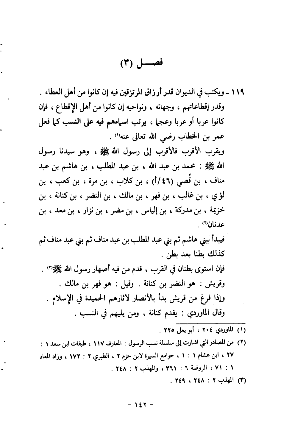 119 - وَيكْتب فِي الدِّيوَان قدر أرزاق المرتزقين فِيهِ إِن كَانُوا من أهل الْعَطاء. وَقدر إقطاعاتهم، وجهاته، ونواحيه إِن كَانُوا من أهل الإقطاع، فَإِن كَانُوا عربا أَو عربا وعجماً، يرتب اسماءهم فِيهِ على النّسَب كَمَا فعل عمر بن الْخطاب رَضِي الله تَعَالَى عَنهُ. وَيقرب الْأَقْرَب فَالْأَقْرَب إِلَى رَسُول الله [صلى الله عَلَيْهِ وَسلم] ، وَهُوَ سيدنَا رَسُول الله [صلى الله عَلَيْهِ وَسلم] : مُحَمَّد بن عبد الله، بن عبد الْمطلب، بن هَاشم بن عبد منَاف، بن قصي (46 / أ) ، بن كلاب، بن مرّة، بن كَعْب، بن لؤَي، بن غَالب، بن فهر، بن مَالك، بن النَّضر، بن كنَانَة، بن خُزَيْمَة، بن مدركة، بن إلْيَاس، بن مُضر، بن نزار بن معد، بن عدنان. فَيبْدَأ ببني هَاشم ثمَّ بني عبد المطلب بن عبد منَاف ثمَّ بني عبد منَاف ثمَّ كَذَلِك بَطنا بعد بطن. فَإِن اسْتَوَى بطْنَان فِي الْقرب، قدم من فِيهِ أَصْهَار رَسُول الله [صلى الله عَلَيْهِ وَسلم] . وقريش: هُوَ النَّضر بن كنَانَة. وَقيل: هُوَ فهر بن مَالك. وَإِذا فرغ من قُرَيْش بَدَأَ بالأنصار لآثارهم الحميدة فِي الْإِسْلَام. وَقَالَ الْمَاوَرْدِيّ: يقدم كنَانَة، وَمن يليهم فِي النّسَب.