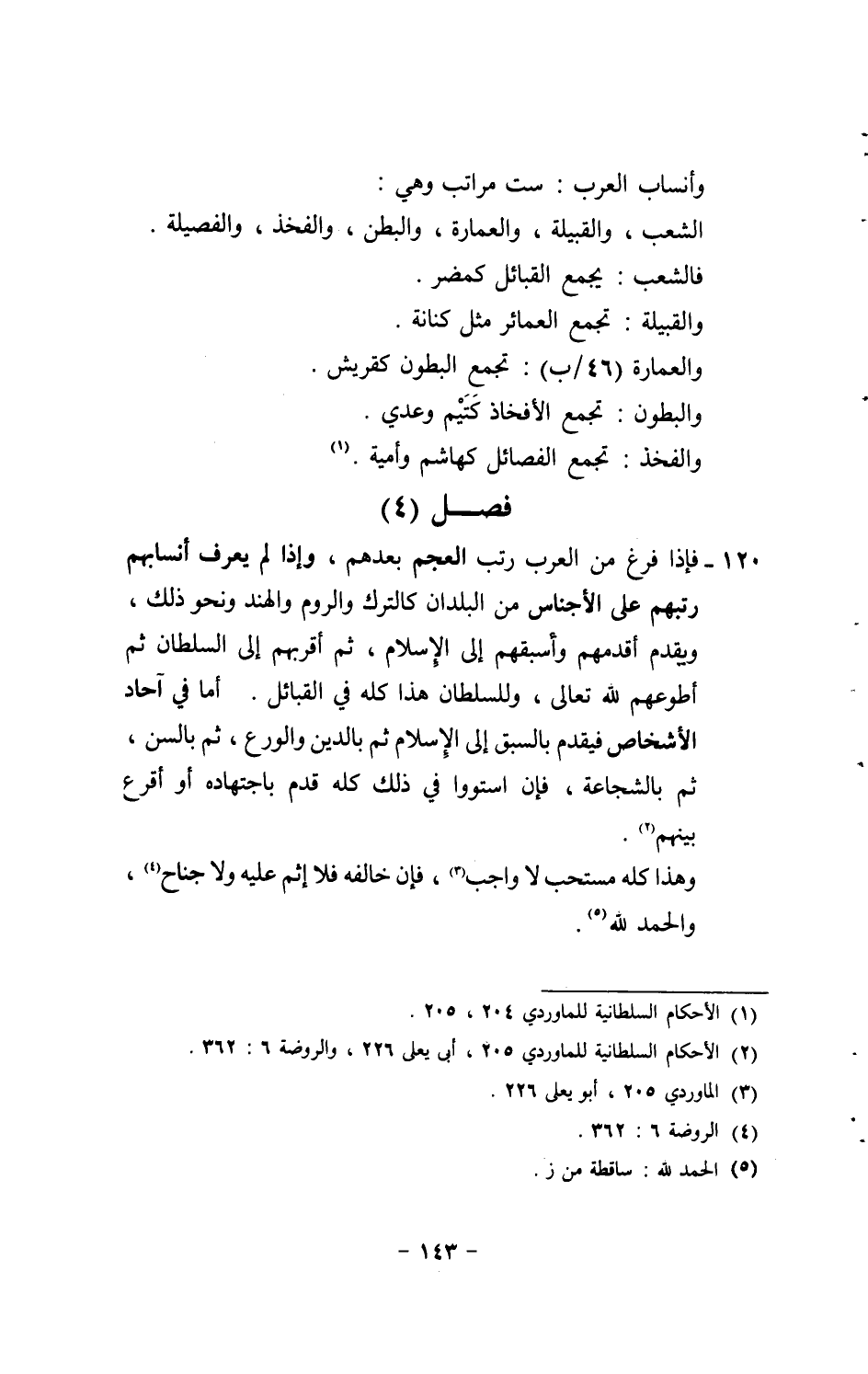 120 - فَإِذا فرغ من الْعَرَب رتب الْعَجم بعدهمْ، وَإِذا لم يعرف أنسابهم رتبهم على الْأَجْنَاس من الْبلدَانِ كالترك وَالروم والهند وَنَحْو ذَلِك، وَيقدم أقدمهم وأسبقهم إِلَى الْإِسْلَام، ثمَّ أقربهم إِلَى السُّلْطَان ثمَّ أطوعهم لله تَعَالَى، وللسلطان هَذَا كُله فِي الْقَبَائِل. أما فِي آحَاد الْأَشْخَاص فَيقدم بِالسَّبقِ إِلَى الْإِسْلَام ثمَّ بِالدّينِ والورع، ثمَّ بِالسِّنِّ، ثمَّ بالشجاعة، فَإِن اسْتَووا فِي ذَلِك كُله قدم بِاجْتِهَادِهِ أَو أَقرع بَينهم. وَهَذَا كُله مُسْتَحبّ لَا وَاجِب، فَإِن خَالفه فَلَا إِثْم عَلَيْهِ وَلَا جنَاح، وَالْحَمْد لله.