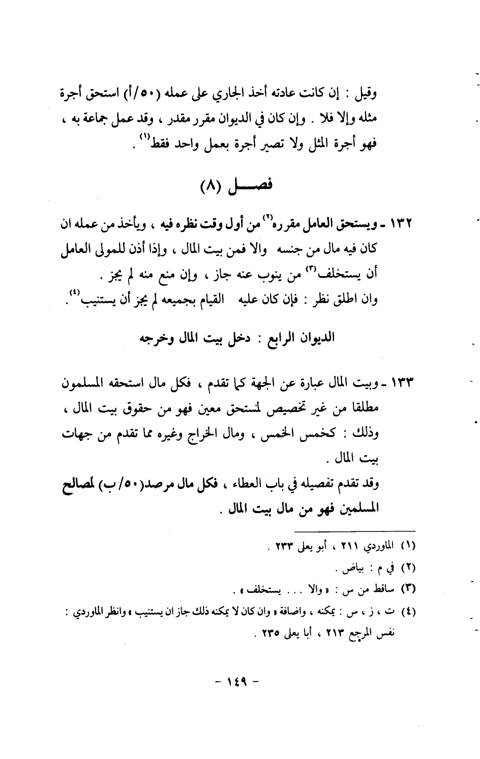 133 - وَبَيت المَال عبارَة عَن الْجِهَة كَمَا تقدم، فَكل مَال اسْتَحَقَّه الْمُسلمُونَ مُطلقًا من غير تَخْصِيص لمستحق معِين فَهُوَ من حُقُوق بَيت المَال، وَذَلِكَ: كخمس الْخمس، وَمَال الْخراج وَغَيره مِمَّا تقدم من جِهَات بَيت المَال. وَقد تقدم تَفْصِيله فِي بَاب الْعَطاء، فَكل مَال مرصد (50 / ب) لمصَالح الْمُسلمين فَهُوَ من مَال بَيت المَال.