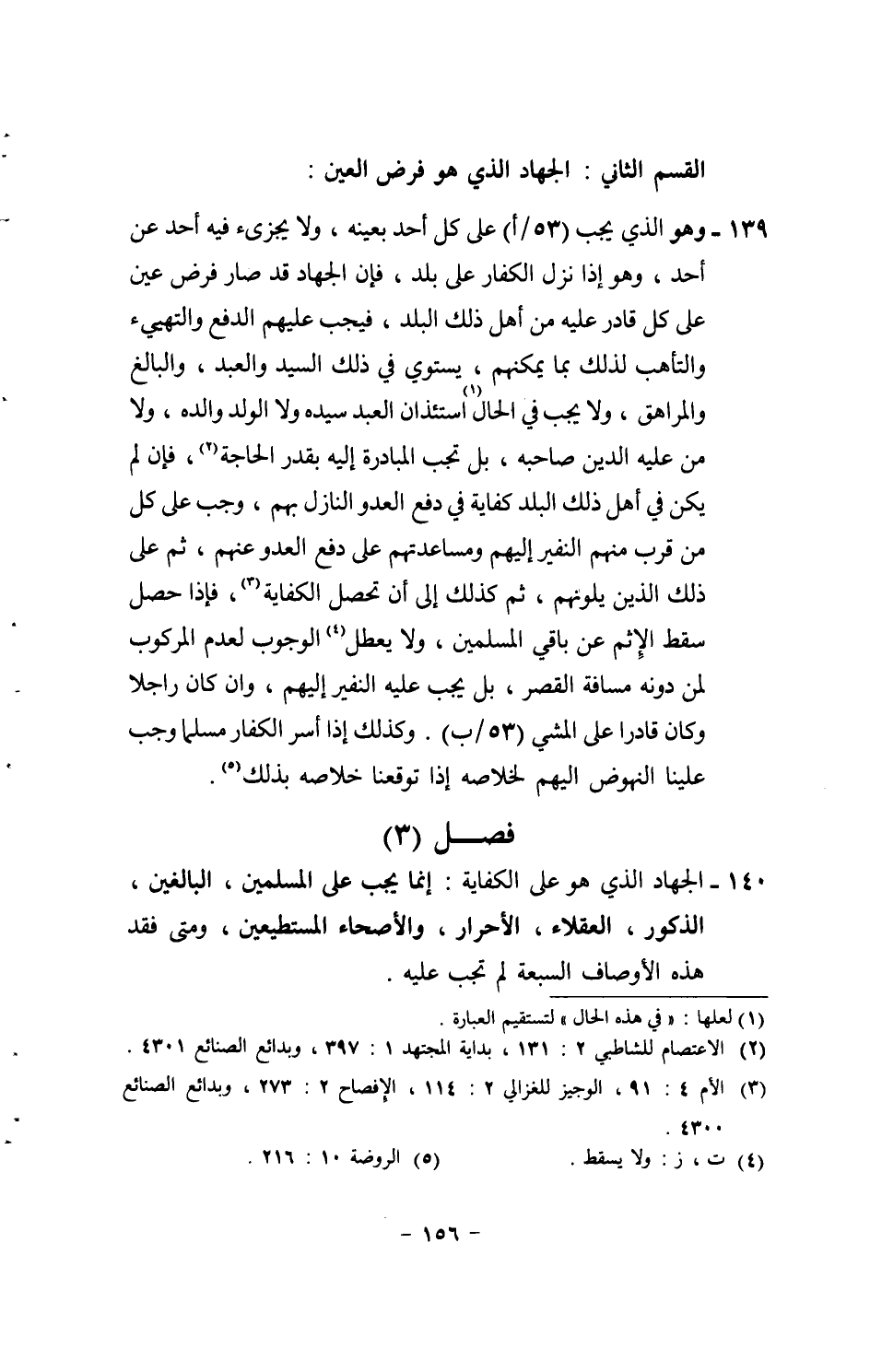 139 - وَهُوَ الَّذِي يجب (53 / أ) على كل أحد يُعينهُ، وَلَا يُجزئ فِيهِ أحد عَن أحد، وَهُوَ إِذا نزل الْكفَّار على بلد، فَإِن الْجِهَاد قد صَار فرض عين على كل قَادر عَلَيْهِ من أهل ذَلِك الْبَلَد، فَيجب عَلَيْهِم الدّفع والتهييء وَالتَّأَهُّب لذَلِك بِمَا يُمكنهُم، يَسْتَوِي فِي ذَلِك السَّيِّد وَالْعَبْد، والبالغ والمراهق، وَلَا يجب فِي الْحَال اسْتِئْذَان العَبْد سَيّده وَلَا الْوَلَد وَالِده، وَلَا من عَلَيْهِ الدّين صَاحبه، بل تجب الْمُبَادرَة إِلَيْهِ بِقدر الْحَاجة، فَإِن لم يكن فِي أهل ذَلِك الْبَلَد كِفَايَة فِي دفع الْعَدو النَّازِل بهم، وَجب على كل من قرب مِنْهُم النفير إِلَيْهِم ومساعدتهم على دفع الْعَدو عَنْهُم، ثمَّ على ذَلِك الَّذين يَلُونَهُمْ، ثمَّ كَذَلِك إِلَى أَن تحصل الْكِفَايَة، فَإِذا حصل سقط الْإِثْم عَن بَاقِي الْمُسلمين، وَلَا يعطل الْوُجُوب لعدم المركوب لمن دونه مَسَافَة الْقصر، بل يجب عَلَيْهِ النفير إِلَيْهِم، وَإِن كَانَ رَاجِلا وَكَانَ قَادِرًا على الْمَشْي (53 / ب) . وَكَذَلِكَ إِذا أسر الْكفَّار مُسلما وَجب علينا النهوض إِلَيْهِم لخلاصه إِذا توقعنا خلاصه بذلك.