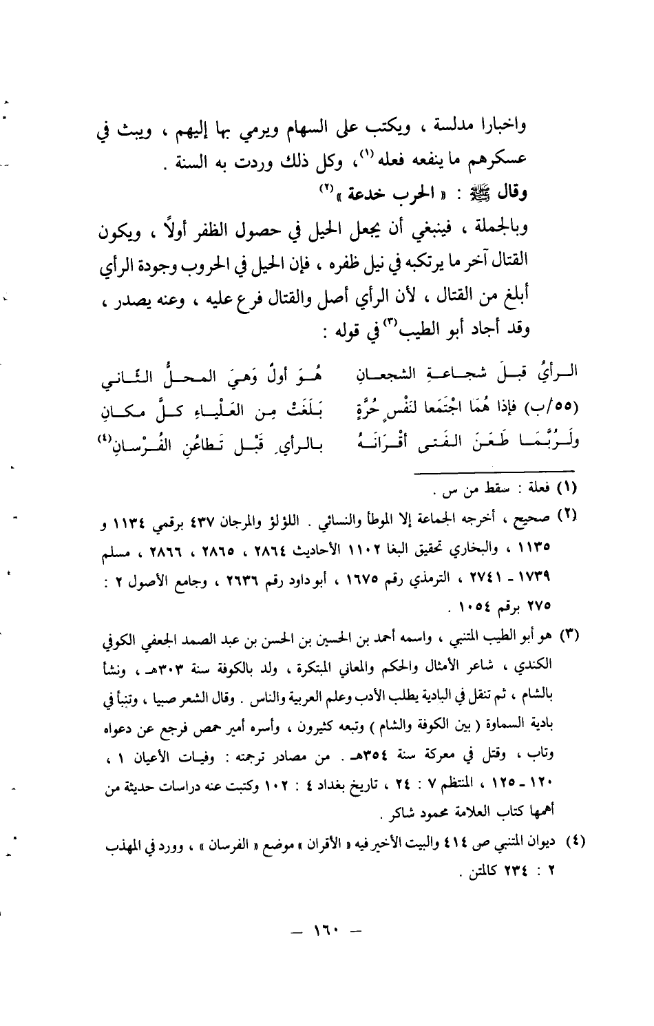 واخباراً مدلسة، وَيكْتب على السِّهَام وَيَرْمِي بهَا إِلَيْهِم، ويبث فِي عَسْكَرهمْ مَا يَنْفَعهُ فعله، وكل ذَلِك وَردت بِهِ السّنة. وَقَالَ [صلى الله عَلَيْهِ وَسلم] : " الْحَرْب خدعة " وَبِالْجُمْلَةِ، فَيَنْبَغِي أَن يَجْعَل الْحِيَل فِي حُصُول الظفر أَولا، وَيكون الْقِتَال آخر مَا يرتكبه فِي نيل ظفره، فَإِن الْحَبل فِي الحروب وجودة الرَّأْي أبلغ من الْقِتَال، لِأَن الرَّأْي أصل والقتال فرع عَلَيْهِ، وَعنهُ يصدر، وَقد أَجَاد أَبُو الطّيب فِي قَوْله: