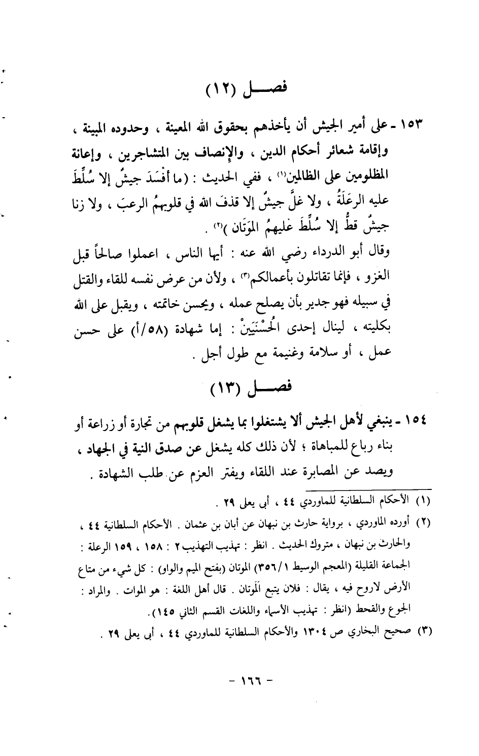 154 - يَنْبَغِي لأهل الْجَيْش أَلا يشتغلوا بِمَا يشغل قُلُوبهم من تِجَارَة أَو زراعة أَو بِنَاء رباع للمباهاة؛ لِأَن ذَلِك كُله يشغل عَن صدق النِّيَّة فِي الْجِهَاد، ويصد عَن المصابرة عِنْد اللِّقَاء ويفتر الْعَزْم عَن طلب الشَّهَادَة.