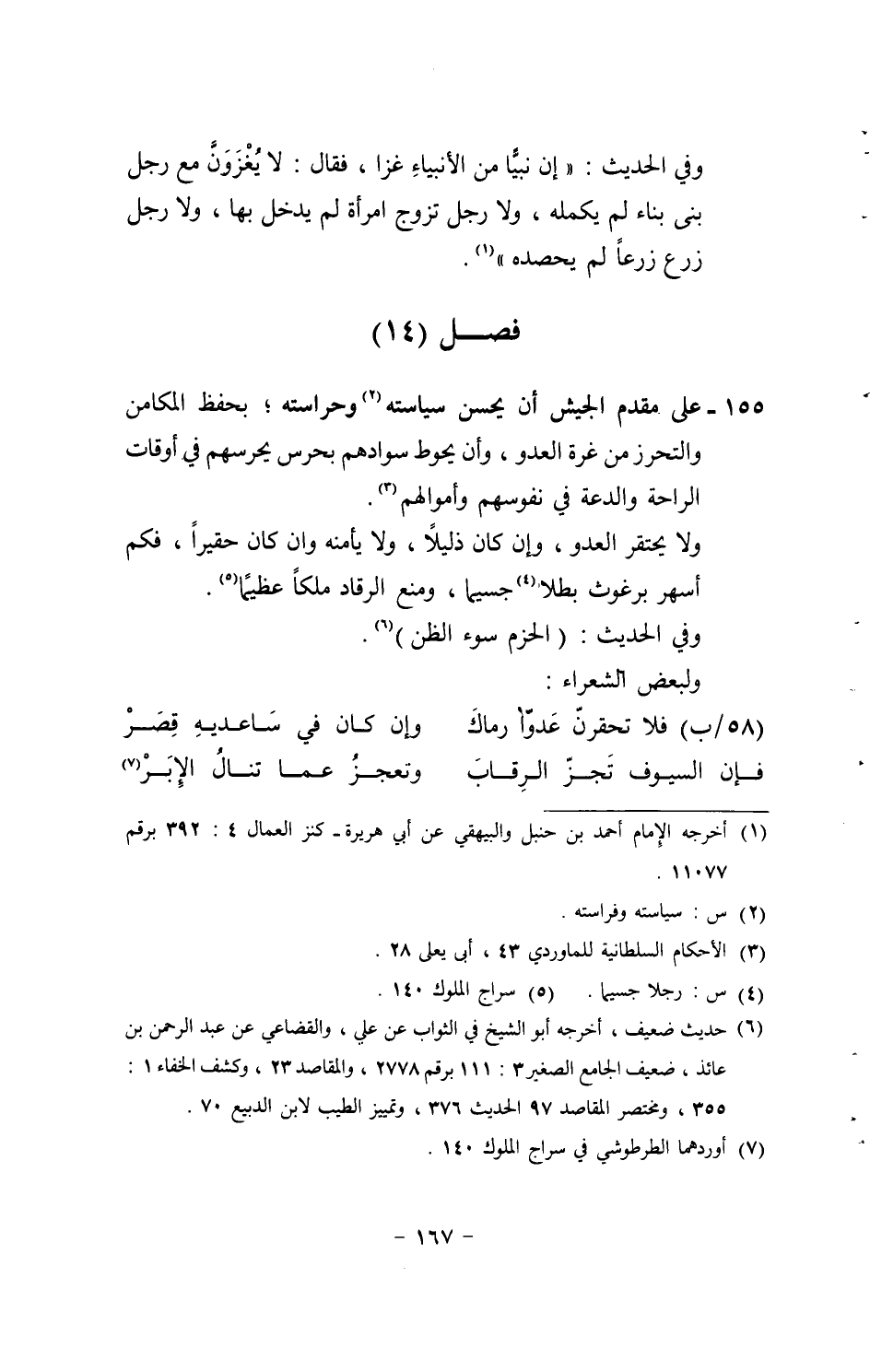 155 - على مقدم الْجَيْش أَن يحسن سياسته وحراسته؛ بِحِفْظ المكامن والتحرز من غرو الْعَدو، وَأَن يحوط سوادهم بحرس يحرسهم فِي أَوْقَات الرَّاحَة والدعة فِي نُفُوسهم وَأَمْوَالهمْ. وَلَا يحتقر الْعَدو، وَإِن كَانَ ذليلاً، وَلَا يأمنه وَإِن كَانَ حَقِيرًا، فكم أسهر برغوث بطلاً جسيماً، وَمنع الرقاد ملكا عَظِيما. وَفِي الحَدِيث: (الحزم سوء الظَّن) . ولبعض الشُّعَرَاء: