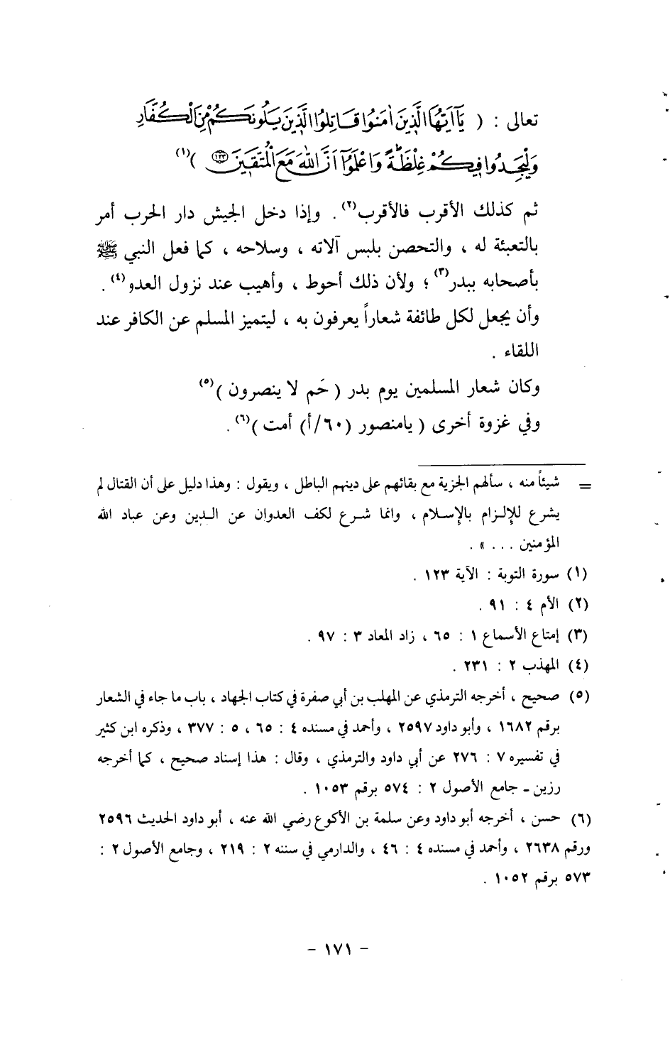 ثمَّ كَذَلِك الْأَقْرَب فَالْأَقْرَب. وَإِذا دخل الْجَيْش دَار الْحَرْب أَمر بالتعبئة لَهُ، والتحصن بِلبْس آلاته، وسلاحه، كَمَا فعل النَّبِي [صلى الله عَلَيْهِ وَسلم] بِأَصْحَابِهِ ببدر؛ وَلِأَن ذَلِك أحوط، وأهيب عِنْد نزُول الْعَدو. وَأَن يَجْعَل لكل طَائِفَة شعاراً يعْرفُونَ بِهِ، ليتميز الْمُسلم عَن الْكَافِر عِنْد اللِّقَاء. وَكَانَ شعار الْمُسلمين يَوْم بدر (حم لَا ينْصرُونَ) وَفِي غَزْوَة أُخْرَى (يَا مَنْصُور (60 / أ) أمت)