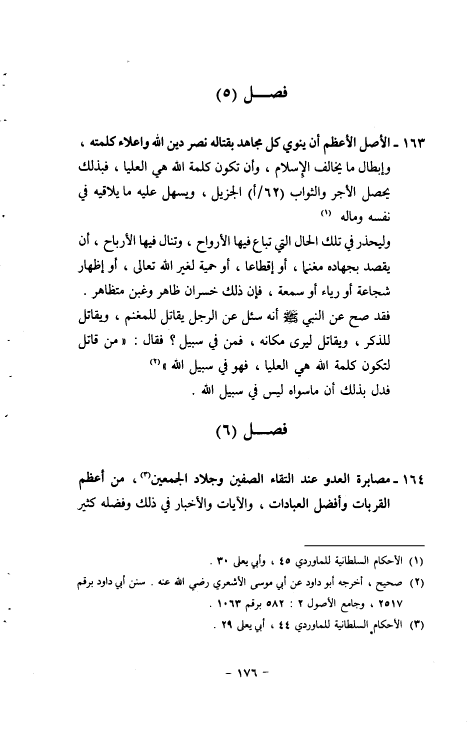 163 - الأَصْل الْأَعْظَم أَن يَنْوِي كل مُجَاهِد بقتاله نصر دين الله وإعلاء كَلمته، وَإِبْطَال مَا يُخَالف الْإِسْلَام، وَأَن تكون كلمة الله هِيَ الْعليا، فبذلك يحصل الْأجر وَالثَّوَاب (62 / أ) الجزيل، ويسهل عَلَيْهِ مَا يلاقيه فِي نَفسه وَمَاله. وليحذر فِي تِلْكَ الْحَال الَّتِي تبَاع فِيهَا الْأَرْوَاح، وتنال فِيهَا الأرباح، أَن يقْصد بجهاده مغنما، أَو إقطاعاً، أَو حمية لغير الله تَعَالَى، أَو إِظْهَار شجاعة أَو رِيَاء أَو سمعة، فَإِن ذَلِك خسران ظَاهر وغبن متظاهر. فقد صَحَّ عَن النَّبِي [صلى الله عَلَيْهِ وَسلم] أَنه سُئِلَ عَن الرجل يُقَاتل للمغنم، وَيُقَاتل للذّكر، وَيُقَاتل ليرى مَكَانَهُ، فَمن فِي سَبِيل؟ فَقَالَ: " من قَاتل لتَكون كلمة الله هِيَ الْعليا، فَهُوَ فِي سَبِيل الله ". فَدلَّ بذلك أَن مَا سواهُ لَيْسَ فِي سَبِيل الله.