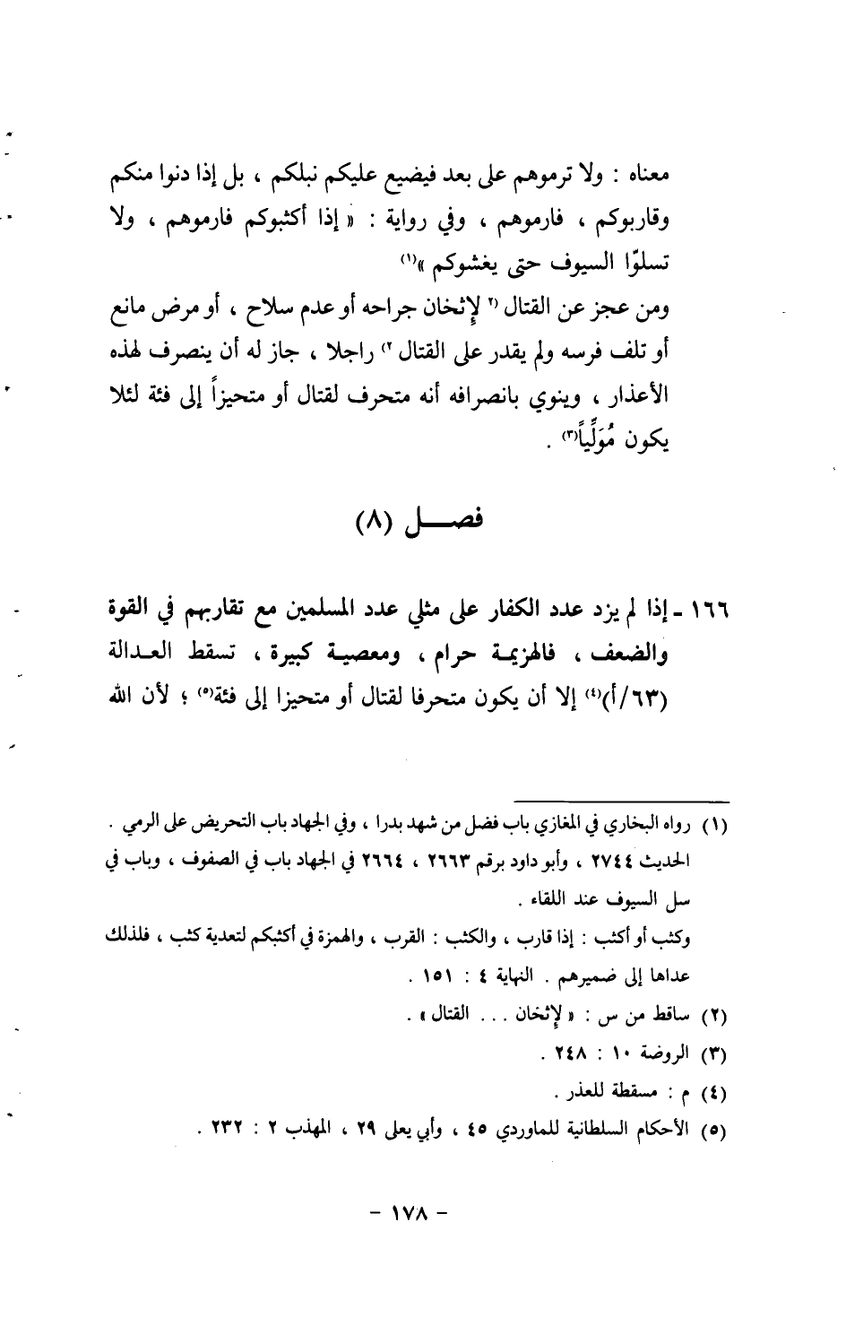 166 - إِذا لم يزدْ عدد الْكفَّار على مثلي عدد الْمُسلمين مَعَ تقاربهم فِي الْقُوَّة والضعف، فالهزيمة حرَام، ومعصية كَبِيرَة، تسْقط الْعَدَالَة (63 / أ) إِلَّا أَن يكون متحرفاً لقِتَال أَو متحيزاً إِلَى فِئَة؛ لِأَن الله