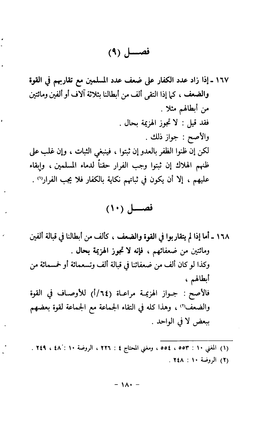 167 - إِذا زَاد عدد الْكفَّار على ضعف عدد الْمُسلمين مَعَ تقاربهم فِي الْقُوَّة والضعف، كَمَا إِذا التقى ألف من أبطالنا بِثَلَاثَة آلَاف أَو أَلفَيْنِ وَمِائَتَيْنِ من أبطالهم مثلا. فقد قيل: لَا تجوز الْهَزِيمَة بِحَال. وَالأَصَح: جَوَاز ذَلِك. لَكِن إِن ظنُّوا الظفر بالعدو إِن ثبتوا، فَيَنْبَغِي الثَّبَات، وَإِن غلب على ظنهم الْهَلَاك إِن ثبتوا وَجب الْفِرَار حَقنا لدماء الْمُسلمين، وإبقاء عَلَيْهِم، إِلَّا أَن يكون فِي ثباتهم نكاية بالكفار فَلَا يجب الْفِرَار.