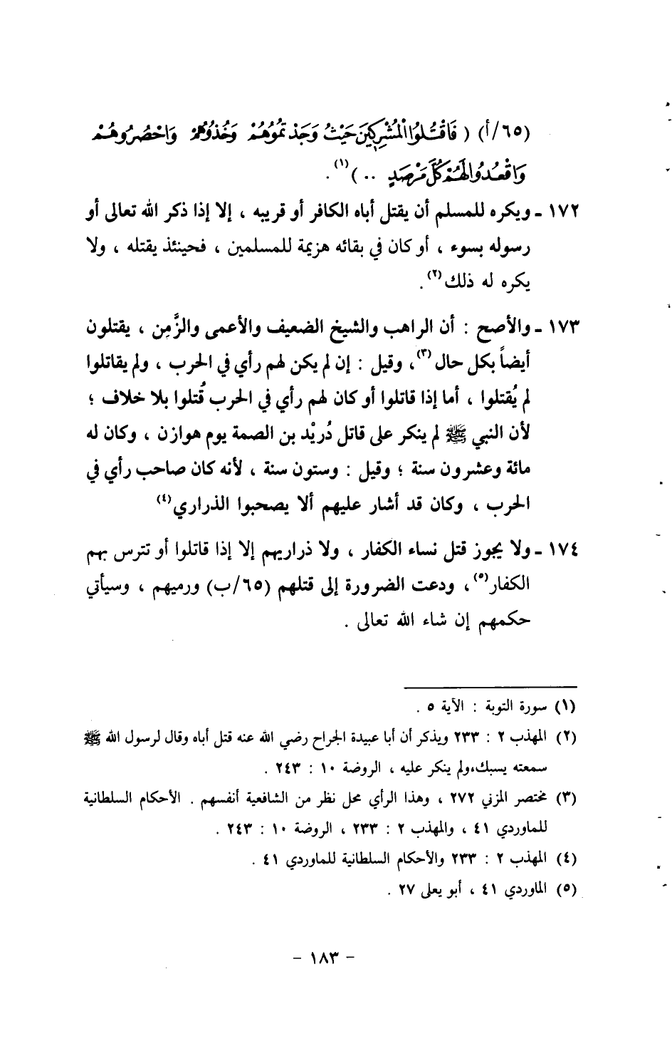 174 - وَلَا يجوز قتل نسَاء الْكفَّار، وَلَا ذَرَارِيهمْ إِلَّا إِذا قَاتلُوا أَو تترس بهم الْكفَّار، ودعت الضَّرُورَة إِلَى قَتلهمْ (65 / ب) ورميهم، وَسَيَأْتِي حكمهم إِن شَاءَ الله تَعَالَى.