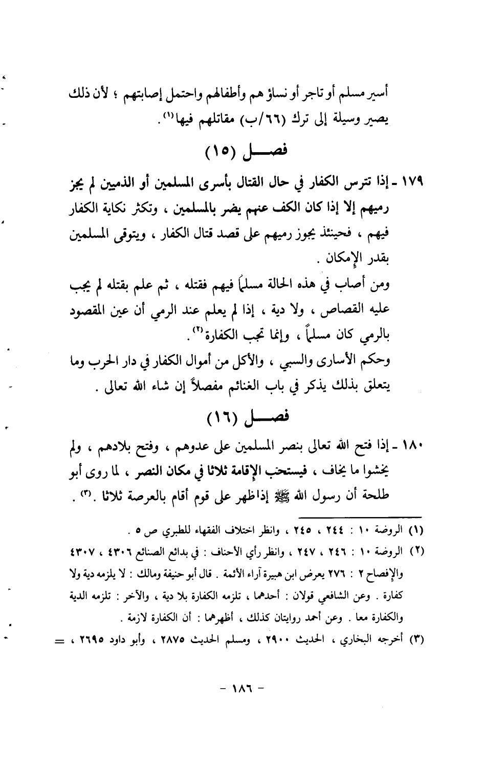 179 - إِذا تترس الْكفَّار فِي حَال الْقِتَال بأسرى الْمُسلمين أَو الذميين لم يجز رميهم إِلَّا إِذا كَانَ الْكَفّ عَنْهُم يضر بِالْمُسْلِمين، وتكثر نكاية الْكفَّار فيهم، فَحِينَئِذٍ يجوز رميهم على قصد قتال الْكفَّار، ويتوقى الْمُسلمين بِقدر الْإِمْكَان. وَمن أصَاب فِي هَذِه الْحَالة مُسلما فيهم فَقتله، ثمَّ علم بقتْله لم يجب عَلَيْهِ الْقصاص، وَلَا دِيَة، إِذا لم يعلم عِنْد الرَّمْي أَن عين الْمَقْصُود بِالرَّمْي كَانَ مُسلما، وَإِنَّمَا تجب الْكَفَّارَة. وَحكم الْأُسَارَى والسبي، وَالْأكل من أَمْوَال الْكفَّار فِي دَار الْحَرْب وَمَا يتَعَلَّق بذلك يذكر فِي بَاب الْغَنَائِم مفصلا إِن شَاءَ الله تَعَالَى.
