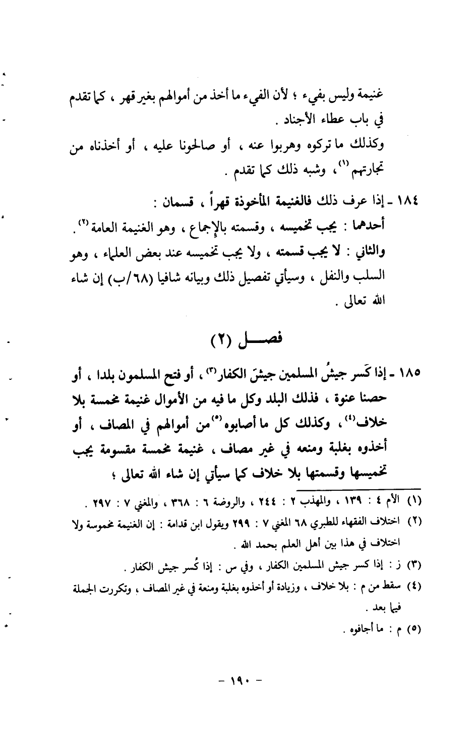 184 - إِذا عرف ذَلِك فالغنيمة الْمَأْخُوذَة قهرا، قِسْمَانِ: أَحدهمَا: يجب تخميسه، وقسمته بِالْإِجْمَاع، وَهُوَ الْغَنِيمَة الْعَامَّة. وَالثَّانِي: لَا يجب قسمته، وَلَا يجب تخميسه عِنْد بعض الْعلمَاء، وَهُوَ السَّلب وَالنَّفْل، وَسَيَأْتِي تَفْصِيل ذَلِك وَبَيَانه شافياً (68 / ب) إِن شَاءَ الله تَعَالَى.