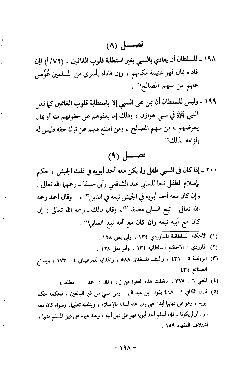 198 - للسُّلْطَان أَن يفادي بِالسَّبْيِ بِغَيْر استطابة قُلُوب الْغَانِمين، (72 / أ) فَإِن فاداه بِمَال فَهُوَ غنيمَة مكانهم، وَإِن فاداه بأسرى من الْمُسلمين عوّض عَنْهُم من سهم الْمصَالح.