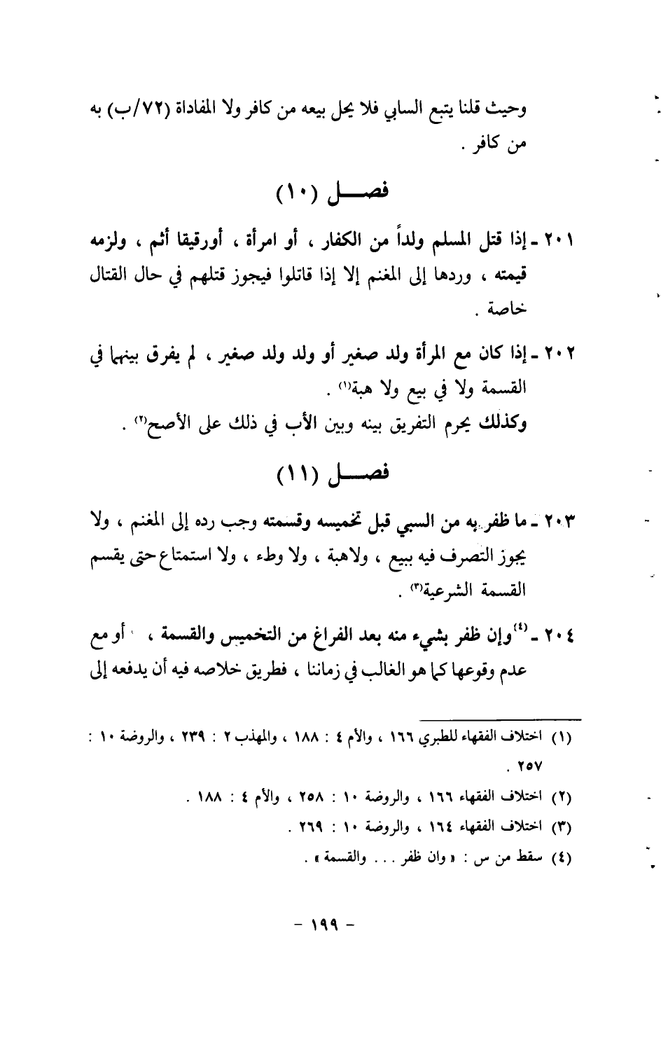 201 - إِذا قتل الْمُسلم ولدا من الْكفَّار، أَو امْرَأَة، أَو رَقِيقا أَثم، وَلَزِمَه قِيمَته، وردهَا إِلَى الْمغنم إِلَّا إِذا قَاتلُوا فَيجوز قَتلهمْ فِي حَال الْقِتَال خَاصَّة.