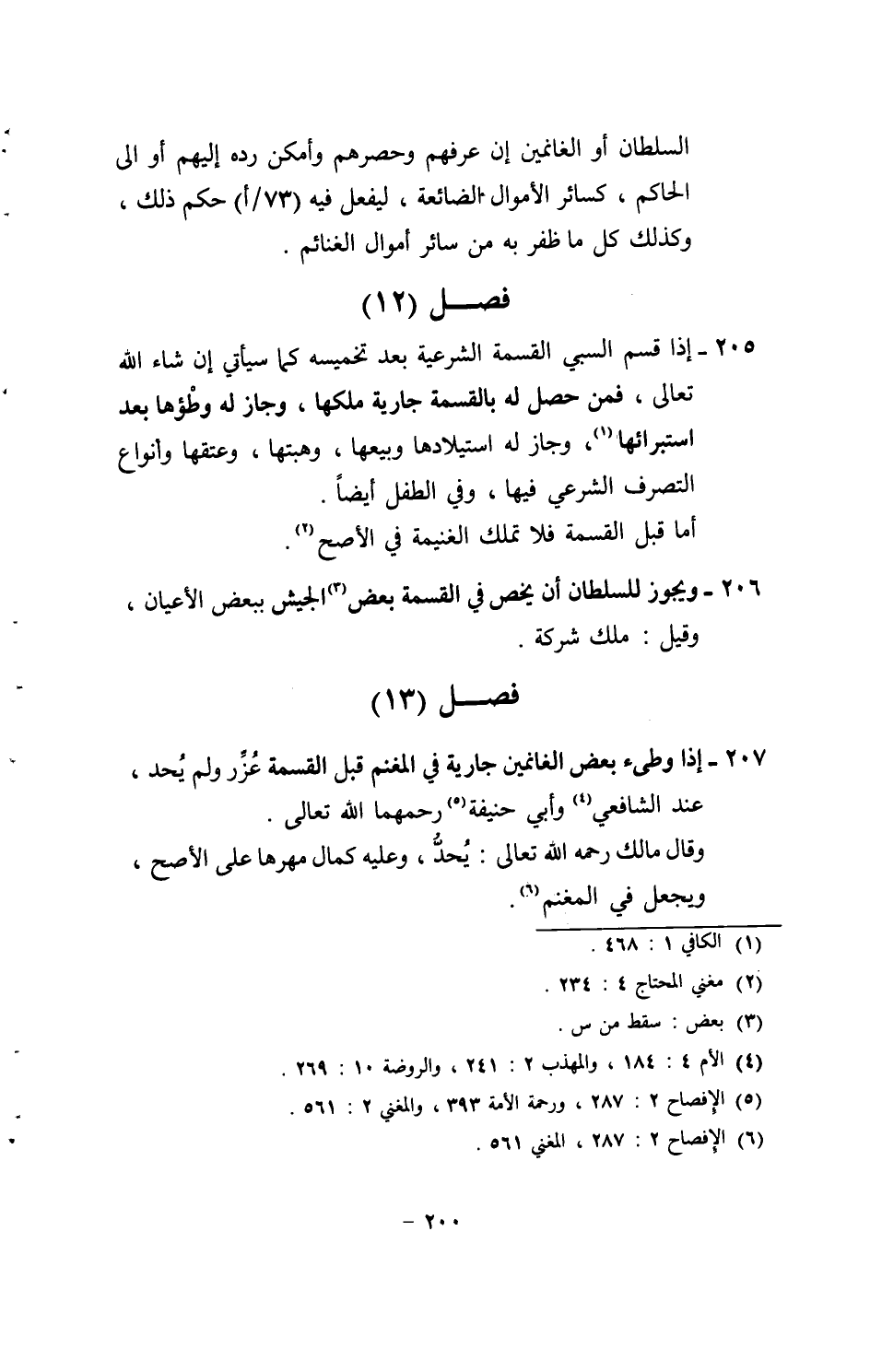 206 - وَيجوز للسُّلْطَان أَن يخص فِي الْقِسْمَة بعض الْجَيْش بِبَعْض الْأَعْيَان، وَقيل: ملك شركَة.