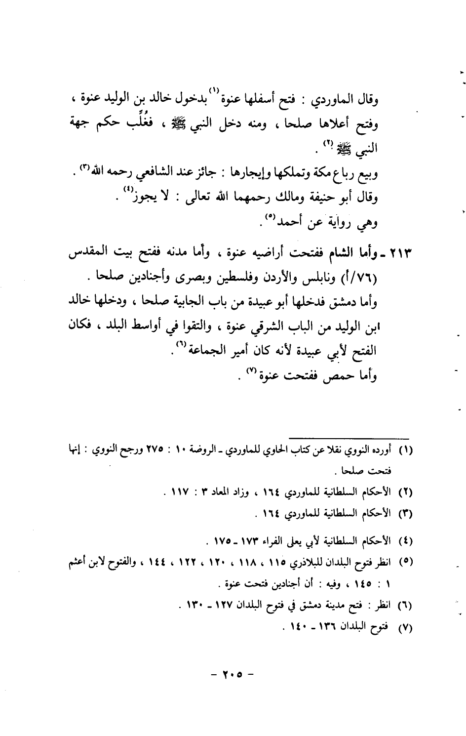213 - وَأما الشَّام ففتحت أراضيه عنْوَة، وَأما مدنه فَفتح بَيت الْمُقَدّس (76 / أ) ونابلس والأردن وفلسطين وَبصرى وأجنادين صلحا. وَأما دمشق فَدَخلَهَا أَبُو عُبَيْدَة من بَاب الْجَابِيَة صلحا، ودخلها خَالِد ابْن الْوَلِيد من الْبَاب الشَّرْقِي عنْوَة، والتقوا فِي أواسط الْبَلَد، فَكَانَ الْفَتْح لأبي عُبَيْدَة لِأَنَّهُ كَانَ أَمِير الْجَمَاعَة. وَأما حمص ففتحت عنْوَة.