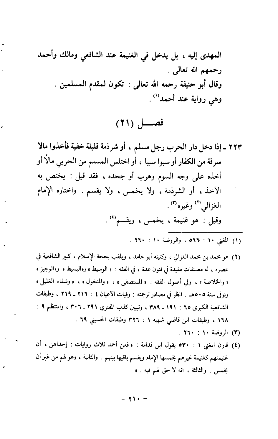 223 - إِذا دخل دَار الْحَرْب رجل مُسلم، أَو شرذمة قَليلَة خُفْيَة فَأخذُوا مَالا سَرقَة من الْكفَّار أَو سبوا سبيا، أَو اختلس الْمُسلم من الْحَرْبِيّ مَالا أَو أَخذه على وَجه السّوم وهرب أَو جَحده، فقد قيل: يخْتَص بِهِ الْآخِذ، أَو الشرذمة، وَلَا يُخَمّس، وَلَا يقسم. وَاخْتَارَهُ الإِمَام الْغَزالِيّ وَغَيره. وَقيل: هُوَ غنيمَة، يُخَمّس، وَيقسم.