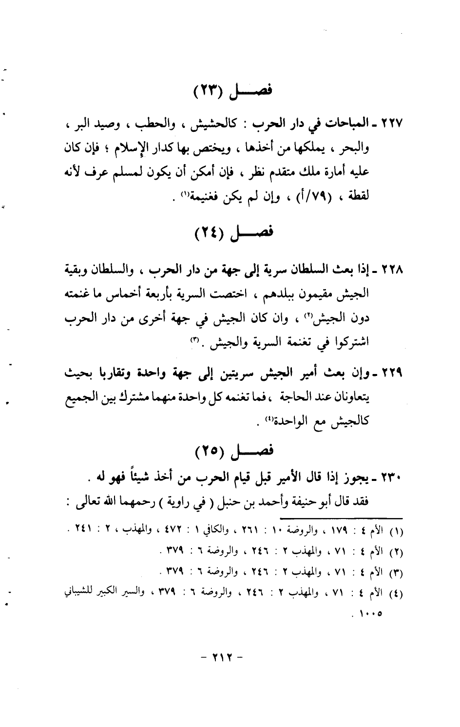 228 - إِذا بعث السُّلْطَان سَرِيَّة إِلَى جِهَة من دَار الْحَرْب، وَالسُّلْطَان وَبَقِيَّة الْجَيْش مقيمون ببلدهم، اخْتصّت السّريَّة بأَرْبعَة أَخْمَاس مَا غنمته دون الْجَيْش، وَإِن كَانَ الْجَيْش فِي جِهَة أُخْرَى من دَار الْحَرْب اشْتَركُوا فِي تغنمة السّريَّة والجيش.