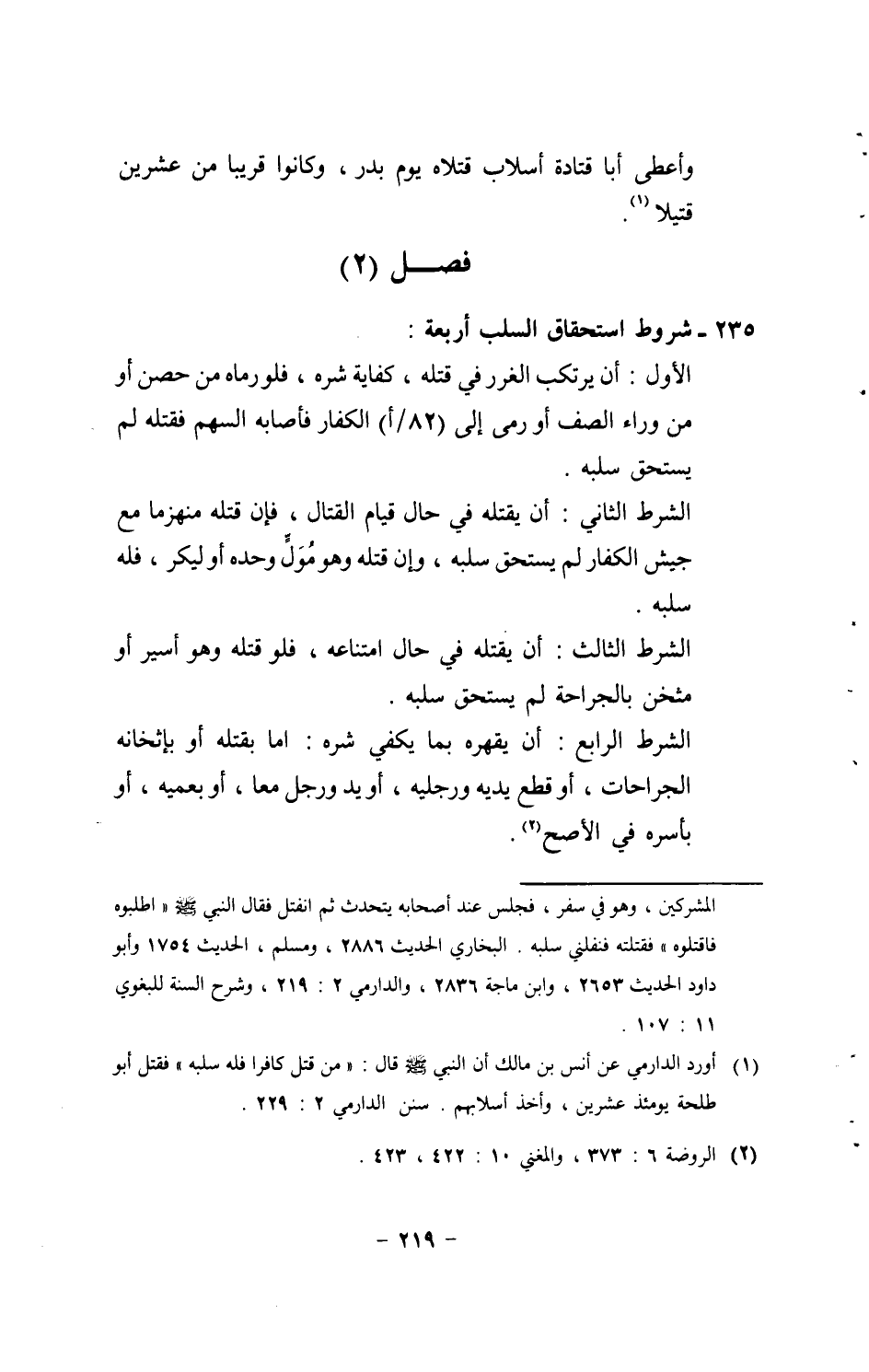 235 - شُرُوط اسْتِحْقَاق السَّلب أَرْبَعَة: الأول: أَن يرتكب الْغرَر فِي قَتله، كِفَايَة شَره، فَلَو رَمَاه من حصن أَو من وَرَاء الصَّفّ أَو رمى إِلَى (82 / أ) الْكفَّار فَأَصَابَهُ السهْم فَقتله لم يسْتَحق سلبه. الشَّرْط الثَّانِي: أَن يقْتله فِي حَال قيام الْقِتَال، فَإِن قَتله مُنْهَزِمًا مَعَ جَيش الْكفَّار لم يسْتَحق سلبه، وَإِن قَتله وَهُوَ مول وَحده أَو ليكر، فَلهُ سلبه. الشَّرْط الثَّالِث: أَن يقْتله فِي حَال امْتِنَاعه، فَلَو قَتله وَهُوَ أَسِير أَو مثخن بالجراحة لم يسْتَحق سلبه. الشَّرْط الرَّابِع: أَن يَقْهَرهُ بِمَا يَكْفِي شَره: اما بقتْله أَو بإثخانه الْجِرَاحَات، أَو قطع يَدَيْهِ وَرجلَيْهِ، أَو يَد وَرجل مَعًا، أَو بعميه، أَو بأسره فِي الْأَصَح.