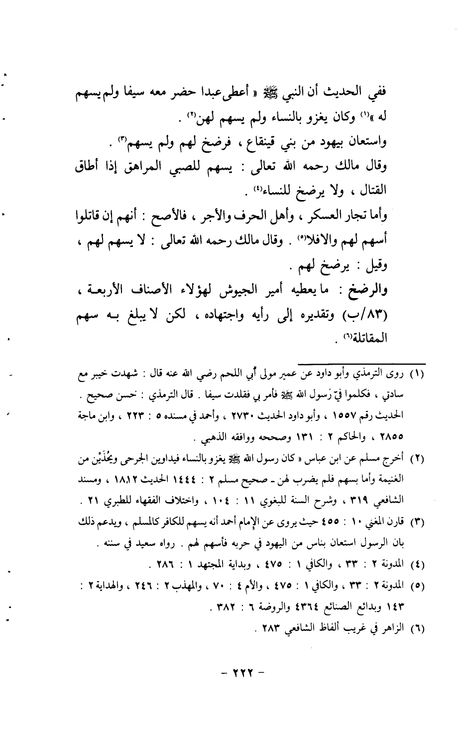 فَفِي الحَدِيث أَن النَّبِي [صلى الله عَلَيْهِ وَسلم] " أعْطى عبدا حضر مَعَه سَيْفا وَلم يُسهم لَهُ " وَكَانَ يَغْزُو بِالنسَاء وَلم يُسهم لَهُنَّ. واستعان بيهود من بني قينقاع، فرضخ لَهُم وَلم يُسهم. وَقَالَ مَالك رَحمَه الله تَعَالَى: يُسهم للصَّبِيّ الْمُرَاهق إِذا أطَاق الْقِتَال، وَلَا يرْضخ للنِّسَاء. وَأما تجار الْعَسْكَر، وَأهل الْحَرْف وَالْأَجْر، فَالْأَصَحّ: أَنهم إِن قَاتلُوا أسْهم لَهُم وَإِلَّا فَلَا. وَقَالَ مَالك رَحمَه الله تَعَالَى: لَا يُسهم لَهُم، وَقيل: يرْضخ لَهُم. والرضخ: مَا يُعْطِيهِ أَمِير الجيوش لهَؤُلَاء الْأَصْنَاف الْأَرْبَعَة، (83 / ب) وَتَقْدِيره إِلَى رَأْيه واجتهاده، لَكِن لَا يبلغ بِهِ سهم الْمُقَاتلَة.