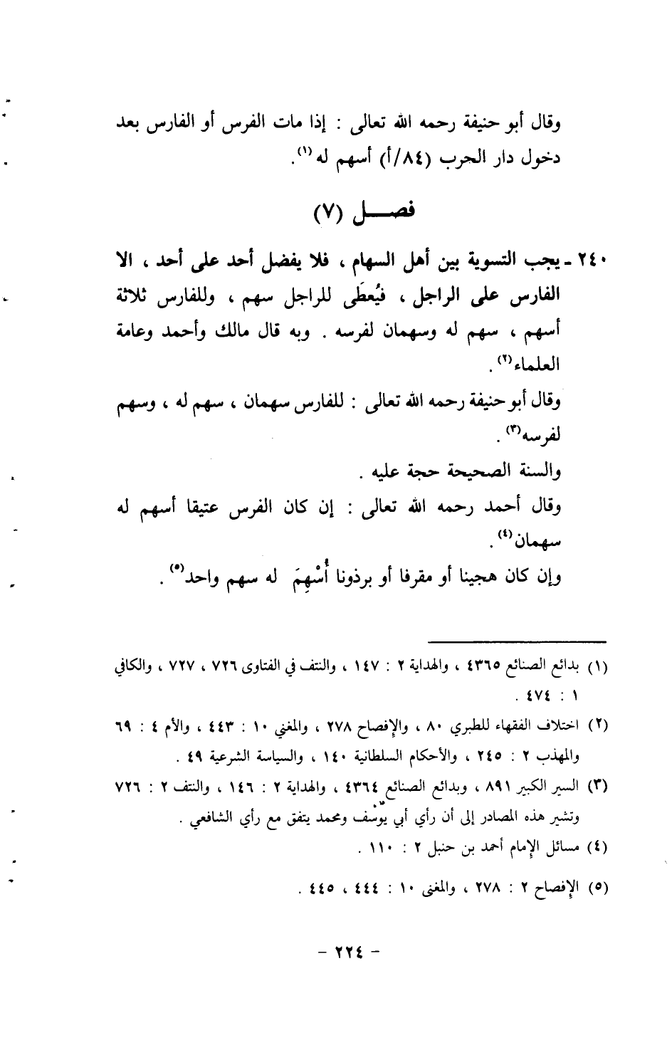 240 - يجب التَّسْوِيَة بَين أهل السِّهَام، فَلَا يفضل أحد على أحد، إِلَّا الْفَارِس على الراجل، فُيعطى للراجل سهم، وللفارس ثَلَاثَة أسْهم، سهم لَهُ وسهمان لفرسه. وَبِه قَالَ مَالك وَأحمد وَعَامة الْعلمَاء. وَقَالَ أَبُو حنيفَة رَحمَه الله تَعَالَى: للفارس سَهْمَان، سهم لَهُ، وَسَهْم لفرسه. وَالسّنة الصَّحِيحَة حجَّة عَلَيْهِ. وَقَالَ أَحْمد رَحمَه الله تَعَالَى: إِن كَانَ الْفرس عتيقا أسْهم لَهُ سَهْمَان. وَإِن كَانَ هجينا أَو مقرفا أَو برذونا أسْهم لَهُ سهم وَاحِد.