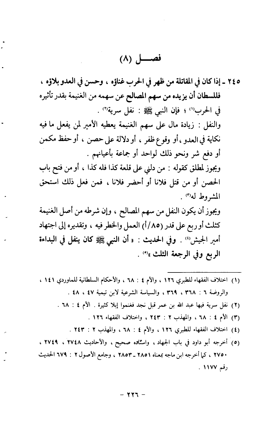 245 - إِذا كَانَ فِي مقاتلة من ظهر فِي الْحَرْب غناؤه، وَحسن فِي الْعَدو بلاؤه، فللسطان أَن يزِيدهُ من سهم الْمصَالح عَن سَهْمه من الْغَنِيمَة بِقدر تَأْثِيره فِي الْحَرْب؛ فَإِن النَّبِي [صلى الله عَلَيْهِ وَسلم] : نفل سَرِيَّة. وَالنَّفْل: زِيَادَة مَال على سهم الْغَنِيمَة يُعْطِيهِ الْأَمِير لمن يفعل مَا فِيهِ نكاية فِي الْعَدو، أَو وُقُوع ظفر، أَو دلَالَة على حصن، أَو حفظ مكمن أَو دفع شَرّ وَنَحْو ذَلِك لوَاحِد أَو جمَاعَة بأعيانهم. وَيجوز لمُطلق كَقَوْلِه: من دلَّنِي على قلعة كَذَا فَلهُ كَذَا، أَو من فتح بَاب الْحصن أَو من قتل فلَانا أَو أحضر فلَانا، فَمن فعل ذَلِك اسْتحق الْمَشْرُوط لَهُ. وَيجوز أَن يكون النَّفْل من سهم الْمصَالح، وَإِن شَرطه من أصل الْغَنِيمَة كثلث أَو ربع على قدر (85 / أ) الْعَمَل والخطر فِيهِ، وَتَقْدِيره إِلَى اجْتِهَاد أَمِير الْجَيْش. وَفِي الحَدِيث: " أَن النَّبِي [صلى الله عَلَيْهِ وَسلم] كَانَ ينفل فِي الْبدَاءَة الرّبع وَفِي الرّجْعَة الثُّلُث ".