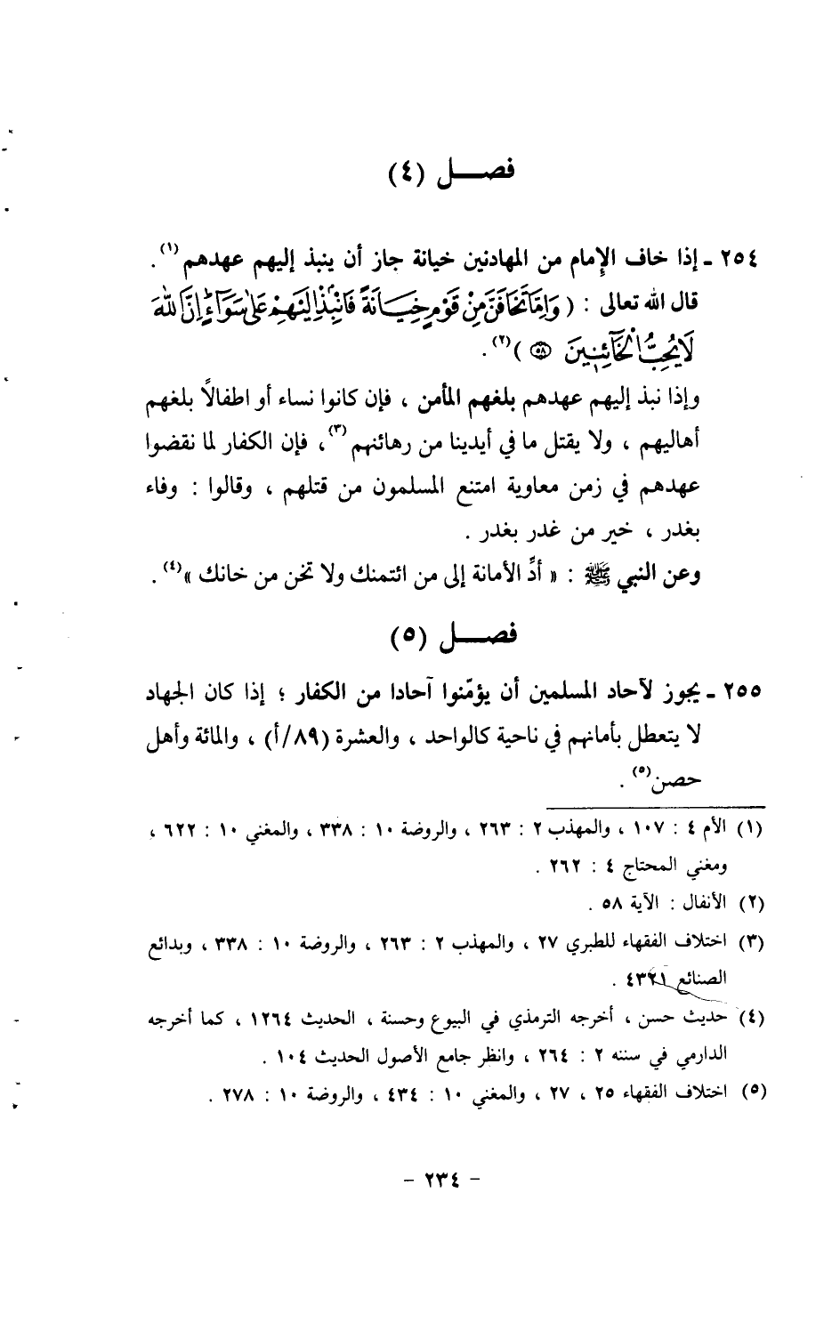 254 - إِذا خَافَ الإِمَام من المهادنين خِيَانَة جَازَ أَن ينْبذ إِلَيْهِم عَهدهم. قَالَ الله تَعَالَى {وَإِمَّا تخافن من قوم خِيَانَة فانبذ إِلَيْهِم على سَوَاء إِن الله لَا يحب الخائنين} وَإِذ نبذ إِلَيْهِم عَهدهم بَلغهُمْ المأمن، فَإِن كَانُوا نسَاء أَو أطفالاً بَلغهُمْ أَهَالِيهمْ، وَلَا يقتل مَا فِي أَيْدِينَا من رهائنهم، فَإِن الْكفَّار لما نقضوا عَهدهم فِي زمن مُعَاوِيَة امْتنع الْمُسلمُونَ من قَتلهمْ، وَقَالُوا: وَفَاء بغدر، خير من غدر بغدر. وَعَن النَّبِي [صلى الله عَلَيْهِ وَسلم] : " إدّ الْأَمَانَة إِلَى من ائتمنك وَلَا تخن من خانك ".