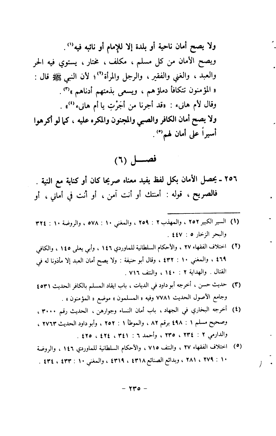 256 - يحصل الْأمان بِكُل لفظ يُفِيد مَعْنَاهُ صَرِيحًا كَانَ أَو كِنَايَة مَعَ النِّيَّة. فالصريح، قَوْله: أمنتك أَو أَنْت آمن، أَو أَنْت فِي أماني، أَو