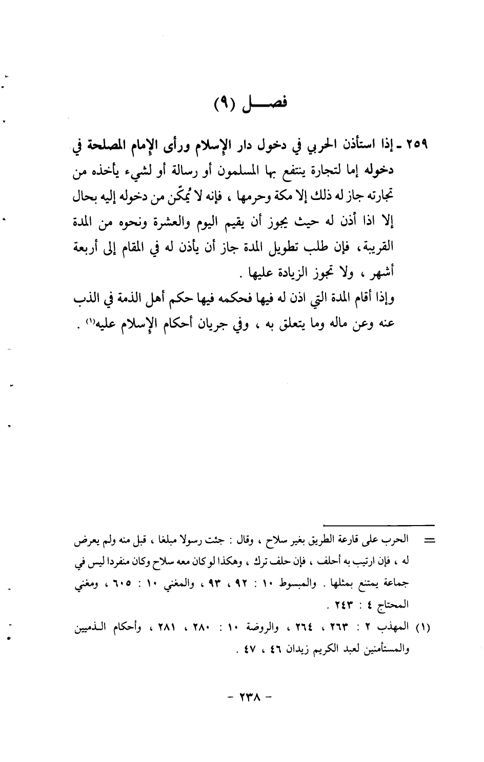 259 - إِذا اسْتَأْذن الْحَرْبِيّ فِي دُخُول دَار الْإِسْلَام وَرَأى الإِمَام الْمصلحَة فِي دُخُوله إِمَّا لتِجَارَة ينْتَفع بهَا الْمُسلمُونَ أَو رِسَالَة أَو لشَيْء يَأْخُذهُ من تِجَارَته جَازَ لَهُ ذَلِك إِلَّا مَكَّة وحرمها، فَإِنَّهُ لَا يُمكن دُخُوله إِلَيْهِ بِحَال إِلَّا إِذا أذن لَهُ حَيْثُ يجوز أَن يُقيم الْيَوْم وَالْعشرَة وَنَحْوه من الْمدَّة الْقَرِيبَة، فَإِن طلب تَطْوِيل الْمدَّة جَازَ أَن يَأْذَن لَهُ فِي الْمقَام إِلَى أَرْبَعَة أشهر، وَلَا تجوز الزِّيَادَة عَلَيْهَا. وَإِذا أَقَامَ الْمدَّة الَّتِي أذن لَهُ فِيهَا فَحكمه فِيهَا حكم أهل الذِّمَّة فِي الذب عَنهُ وَعَن مَاله وَمَا يتَعَلَّق بِهِ، وَفِي جَرَيَان أَحْكَام الْإِسْلَام عَلَيْهِ.