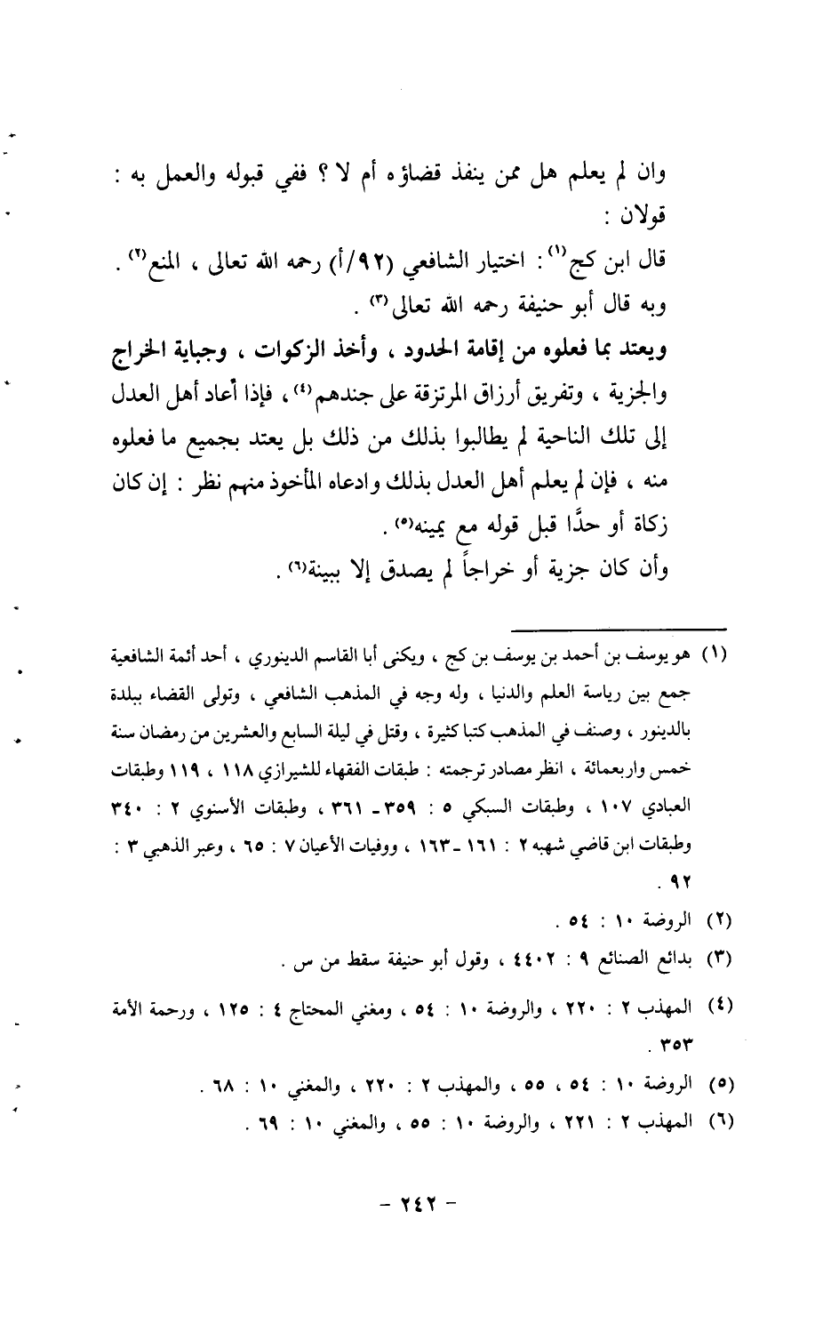 وَإِن لم يعلم هَل مِمَّن ينفذ قَضَاؤُهُ أم لَا؟ فَفِي قبُوله وَالْعَمَل بِهِ: قَولَانِ: قَالَ ابْن كج: اخْتِيَار الشَّافِعِي (92 / أ) رَحمَه الله تَعَالَى، الْمَنْع. وَبِه قَالَ أَبُو حنيفَة رَحمَه الله تَعَالَى. ويعتد بِمَا فَعَلُوهُ من إِقَامَة الْحُدُود، وَأخذ الزكوات، وجباية الْخراج والجزية، وتفريق أرزاق المرتزقه على جندهم، فَإِذا أعَاد أهل الْعدْل إِلَى تِلْكَ النَّاحِيَة لم يطالبوا بذلك من ذَلِك بل يعْتد بِجَمِيعِ مَا فَعَلُوهُ مِنْهُ، فَإِن لم يعلم أهل الْعدْل بذلك وادعاه الْمَأْخُوذ مِنْهُم نظر: إِن كَانَ زَكَاة أَو حدّاً قبل قَوْله مَعَ يَمِينه. وَأَن كَانَ جِزْيَة أَو خراجاً لم يصدق إِلَّا بِبَيِّنَة.