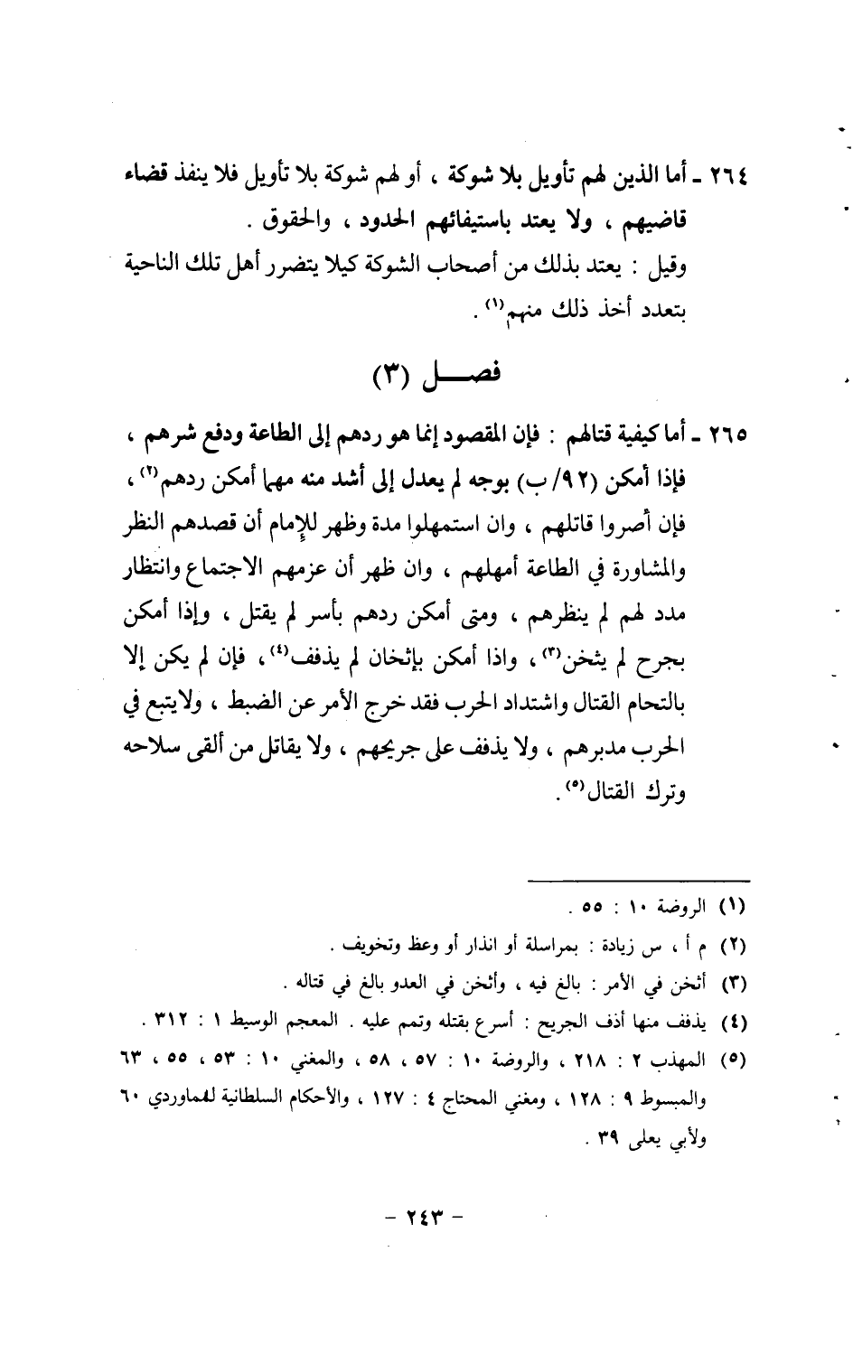 265 - أما كَيْفيَّة قِتَالهمْ: فَإِن الْمَقْصُود إِنَّمَا هُوَ ردهم إِلَى الطَّاعَة وَدفع شرهم، فَإِذا أمكن (92 / ب) بِوَجْه لم يعدل إِلَى أَشد مِنْهُ مهما أمكن ردهم، فَإِن أصروا قَاتلهم، وان اسْتمْهلُوا مُدَّة وَظهر للْإِمَام أَن قصدهم النّظر والمشاورة فِي الطَّاعَة أمهلهم، وان ظهر أَن عزمهم الِاجْتِمَاع وانتظار مدد لَهُم لم ينظرهم، وَمَتى أمكن ردهم بأسر لم يقتل، وَإِذا أمكن بِجرح لم يثخن، وَإِذا أمكن بإثخان لم يذفف، فَإِن لم يكن إِلَّا بالتحام الْقِتَال واشتداد الْحَرْب فقد خرج الْأَمر عَن الضَّبْط، وَلَا يتبع فِي الْحَرْب مدبرهم، وَلَا يذفف على جريحهم، وَلَا يُقَاتل من ألْقى سلاحه وَترك الْقِتَال.