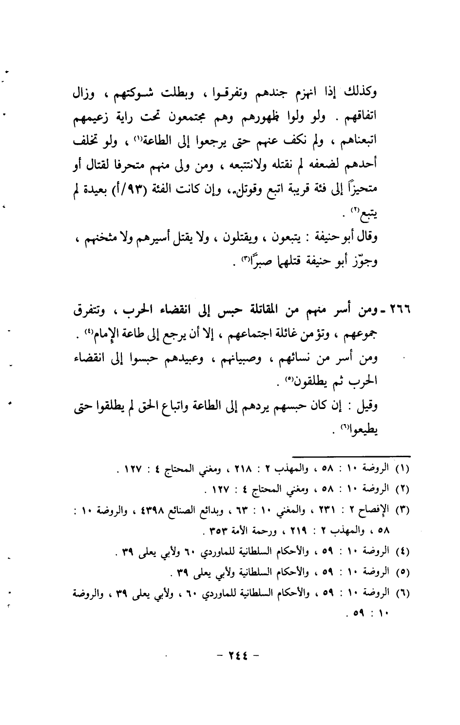 وَكَذَلِكَ إِذا انهزم جندهم وَتَفَرَّقُوا، وَبَطلَت شوكتهم، وَزَالَ اتِّفَاقهم. وَلَو ولوا ظُهُورهمْ وهم مجتمعون تَحت راية زعيمهم اتبعناهم، وَلم نكف عَنْهُم حَتَّى يرجِعوا إِلَى الطَّاعَة، وَلَو تخلف أحدهم لضَعْفه لم نَقْتُلهُ وَلَا نتتبعه، وَمن ولى مِنْهُم متحرفا لقِتَال أَو متحيزاً إِلَى فِئَة قريبَة اتبع وقوتل، وَإِن كَانَت الفئة (93 / أ) بعيدَة لم يتبع. وَقَالَ أَبُو حنيفَة: يتبعُون، وَيقْتلُونَ، وَلَا يقتل أسيرهم وَلَا مثخنهم، وَجوز أَبُو حنيفَة قَتلهمَا صبرا. 266 - وَمن أسر مِنْهُم من الْمُقَاتلَة حبس إِلَى انْقِضَاء الْحَرْب، وتتفرق جموعهم، وتؤمن غائلة اجْتِمَاعهم، إِلَّا أَن يرجع إِلَى طَاعَة الإِمَام. وَمن أسر من نِسَائِهِم، وصبيانهم، وعبيدهم حبسوا إِلَى انْقِضَاء الْحَرْب ثمَّ يطلقون. وَقيل: إِن كَانَ حَبسهم يردهم إِلَى الطَّاعَة وَاتِّبَاع الْحق لم يطلقوا حَتَّى يطيعوا.
